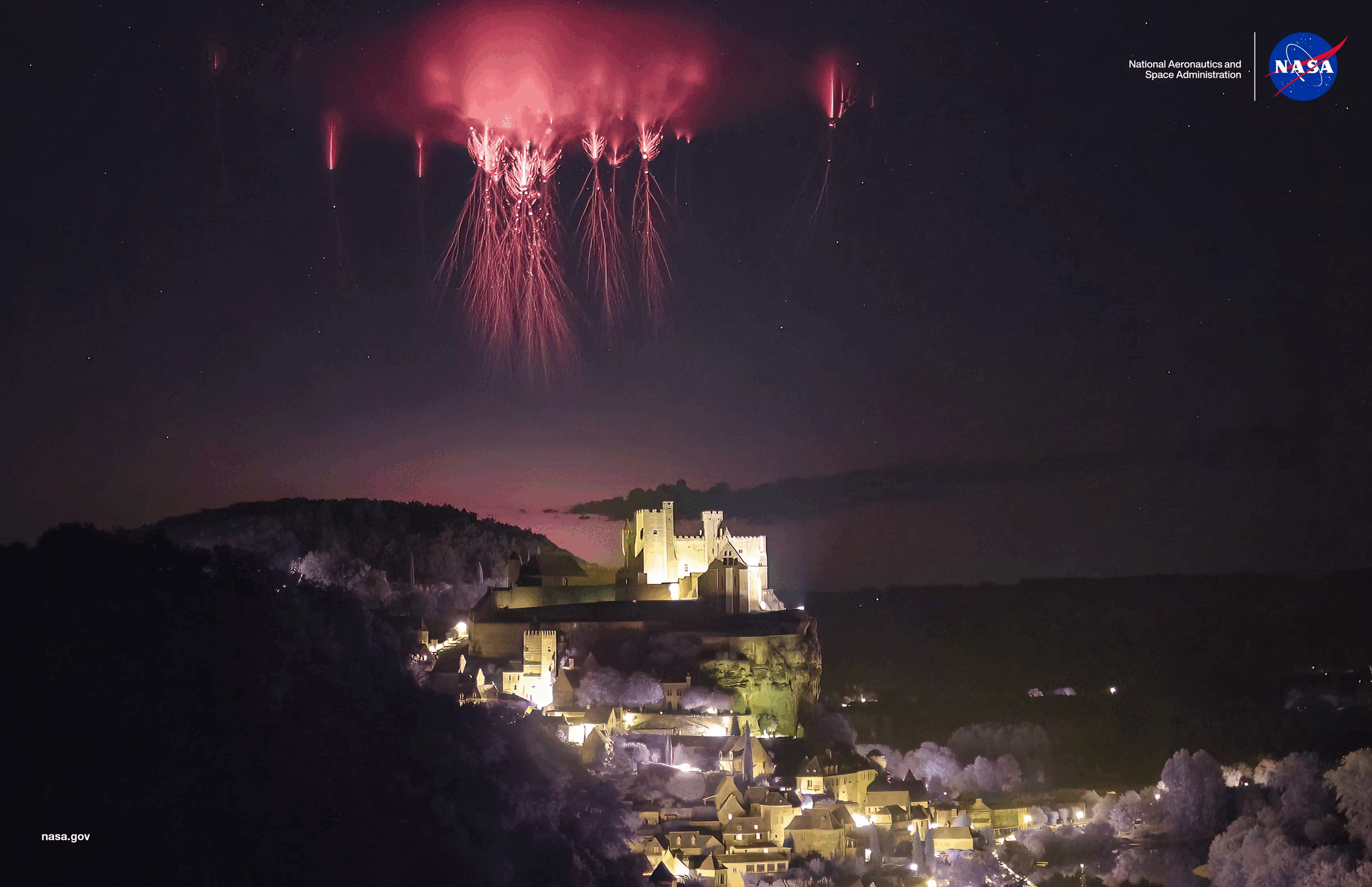 Sprites, like the one seen above the Château de Beynac, are the most common TLEs. However, they are not events you come across every day because of how high in the atmosphere they occur and how short-lived they are. They occur at about 50 miles (80 kilometers) above the Earth’s surface and last only a few milliseconds.