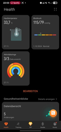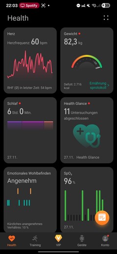 The Health app is divided into five sections: Health, Training, VIP, Devices and Account. The Health tab acts as a dashboard for all recorded biometric data, displayed as customizable tiles.
