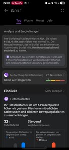 The watch also tracks deep-sleep continuity, breathing quality, heart rate, oxygen saturation, and respiratory rate. Detecting sleep sounds requires a paired smartphone nearby. Overall sleep is rated using a score and a star system, and the software provides analyses and recommendations to improve sleep quality.