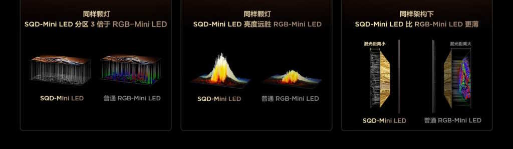 For the 98-inch model, TCL claims a peak brightness of 10,000 nits. This number should be taken with a certain amount of caution, as it certainly does not refer to full-screen brightness. Rather unsurprisingly, these are 4K TV and make use of SQD Mini-LED technology, which is intended to prevent color accuracy errors caused by chromatic aberration. According to the TCL, the BT.2020 color space is fully covered, and a color deviation of Delta E < 1 is advertised.