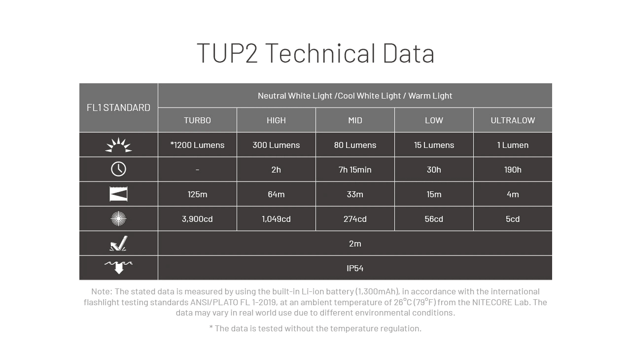 On the plus side, it now features the MCT system, which offers multiple color temperatures via two warm and two cool LEDs, ranging from 3,000, 4,500 to 6,500 Kelvin. This reduces the range from 180 meters to 120 meters. On the other hand, according to the reduced candela values, a stronger floodlight is likely. Then again, the lumen value has increased only from 1,000 to 1,200. This means that the TUP2 is only a limited direct successor. Whether you like the improvements therefore depends heavily on your own requirements for a flashlight.