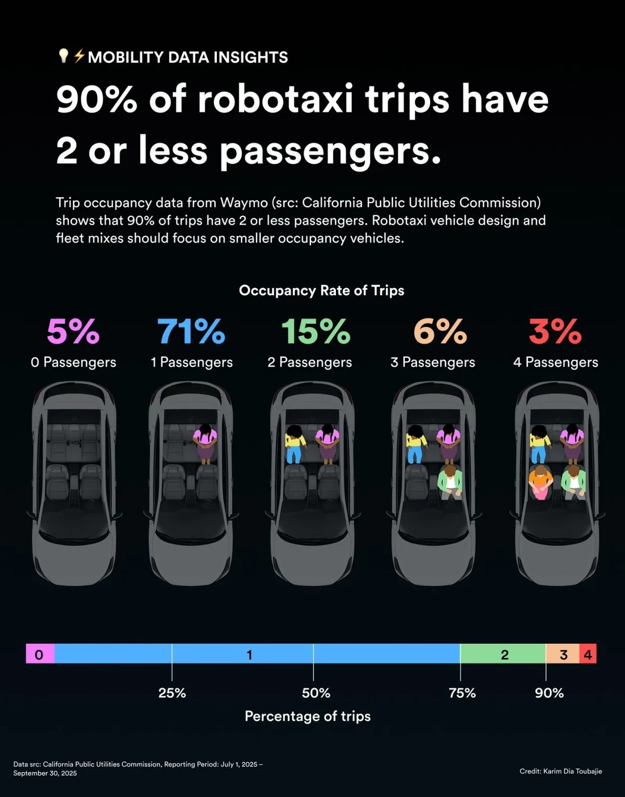 The two-seater concept has now been vindicated by the latest statistics about Waymo's occupancy rates. It turns out that 90% of the driverless trips taken in a robotaxi are done with one or two people. The vast majority of those ride with just one person, too, while only 9% include at least one person on the front seats.