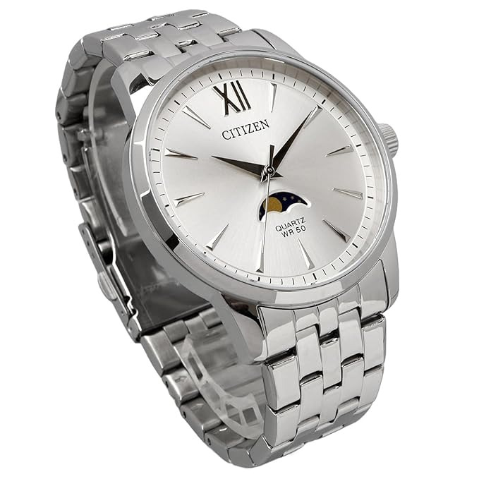 Citizen’s entry-level moonphase model is a slim, dressy 3-hand watch (silver dial) with calendar and moon complications. It typically retails around $100-120. The style is simple and pretty elegant: a silver-tone case and matching steel bracelet, with a symmetrical tri-compax dial (day, date, 24h/moon). As reported by Walmart, it has a quartz movement and is water-resistant to 5 ATM (50 m), enough for daily wear. This Citizen is all about understatement - its most notable feature is a subdial that shows the lunar phase - making it a super subtle yet functional watch for office or dress use.