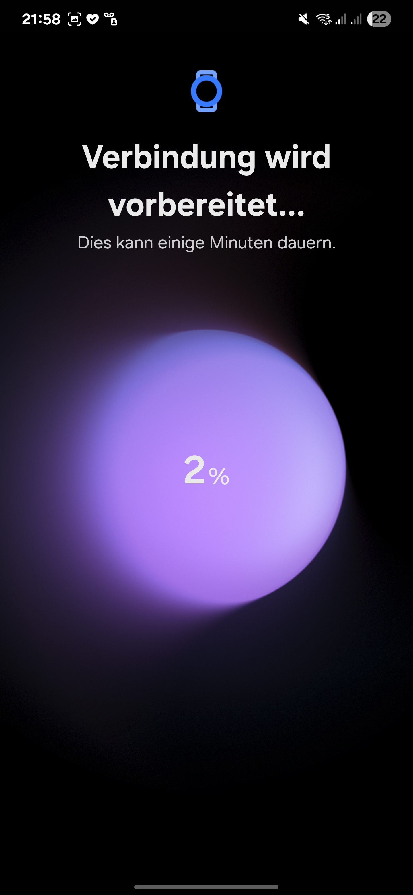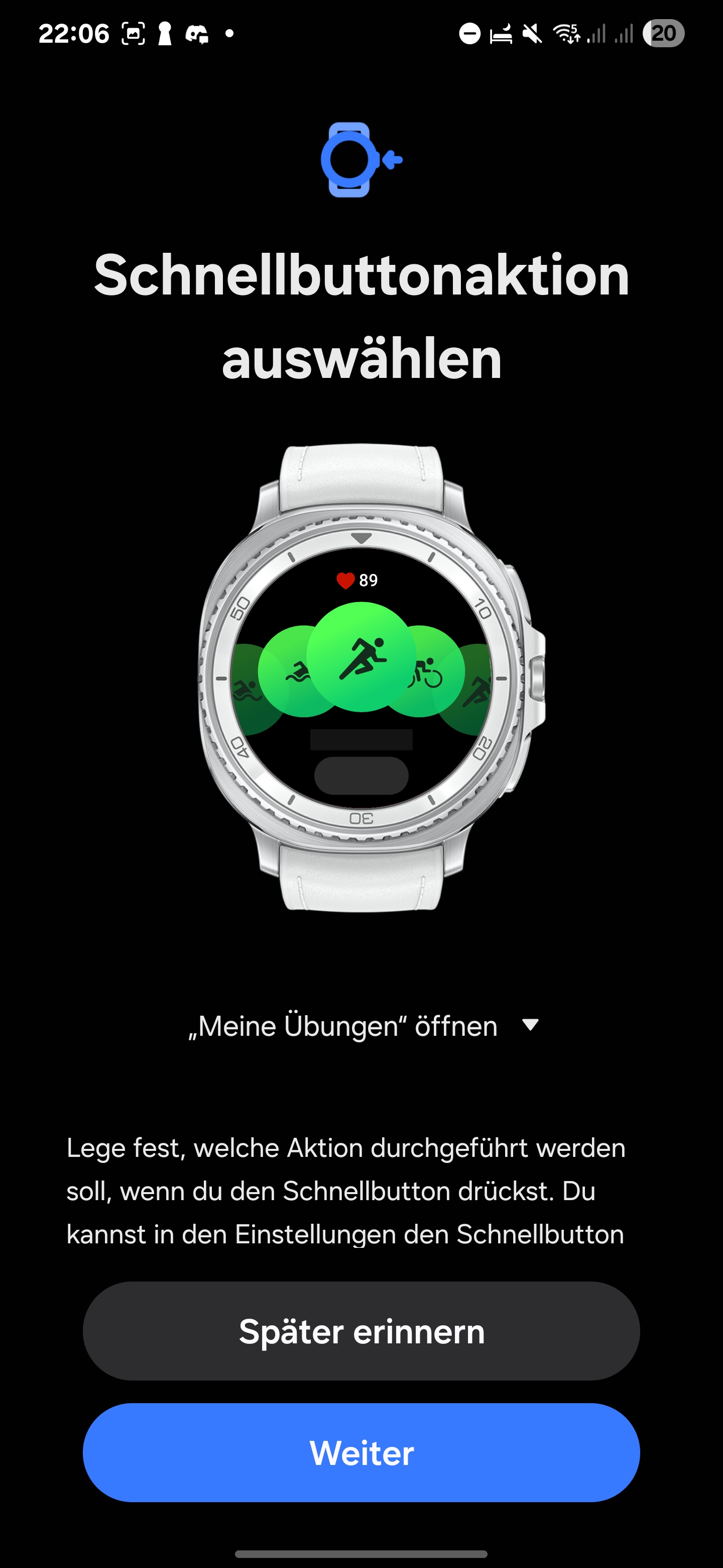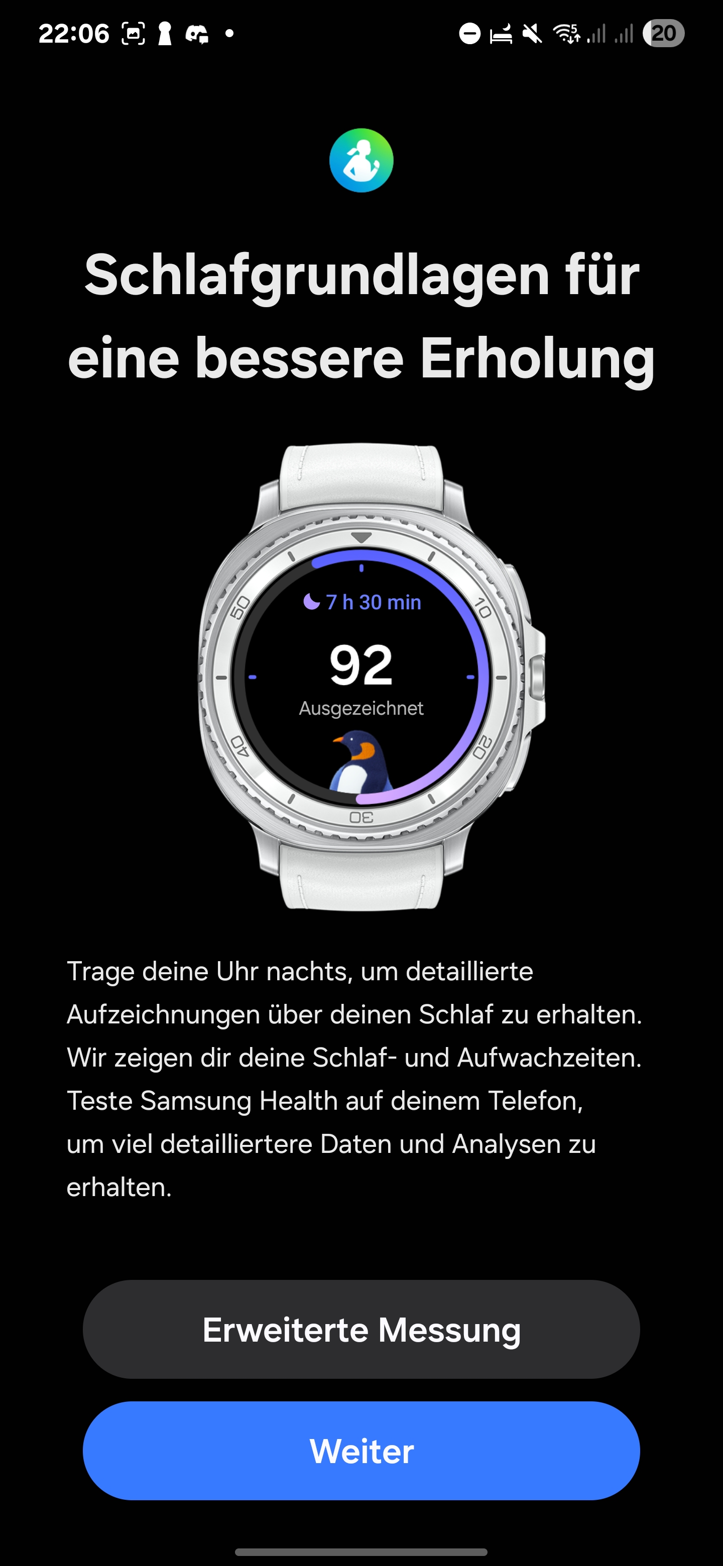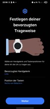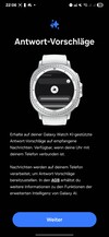 During setup, users are asked about wrist orientation, health features, and basic preferences. Once completed, an overview appears in the app, and a short tutorial runs directly on the watch. All fitness data is managed through the Samsung Health app.