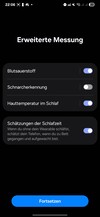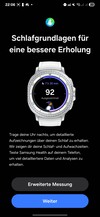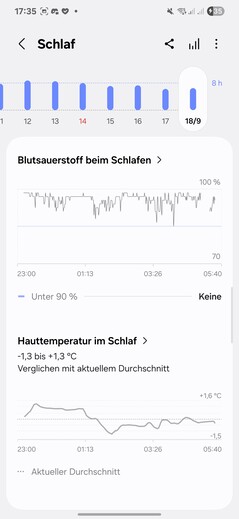 Samsung uses a Sleep Score system for tracking rest. It combines metrics such as total sleep time, deep and REM phases, recovery, and latency, and is supplemented with personalized recommendations and long-term trends. The watch also records heart rate, temperature, oxygen saturation, and breathing rate. Snoring and sleep apnea can be detected when the smartwatch is paired with a smartphone.
