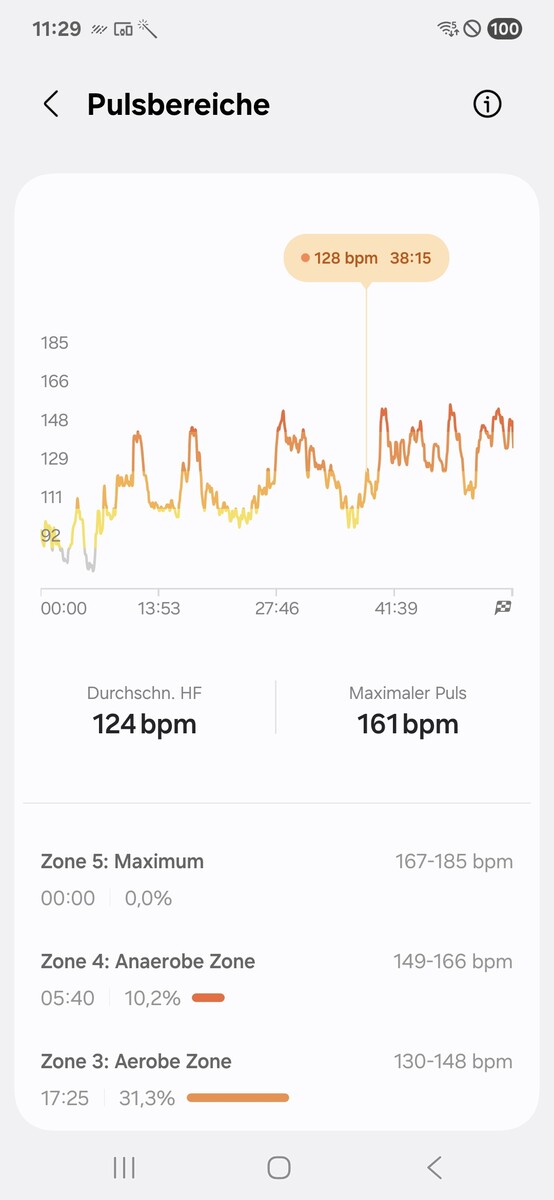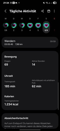 Automatic workout detection works very well. The Samsung Health app also includes video-based training courses, some of which require payment. During testing, we occasionally recorded incorrect entries for gymnastics when using the Quick Button.