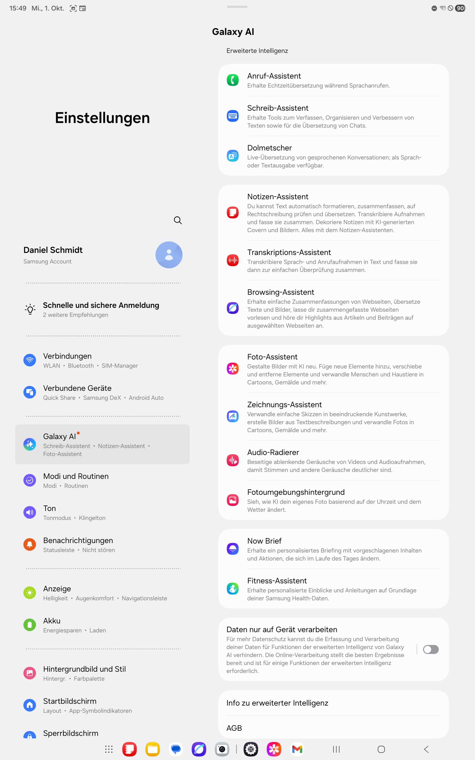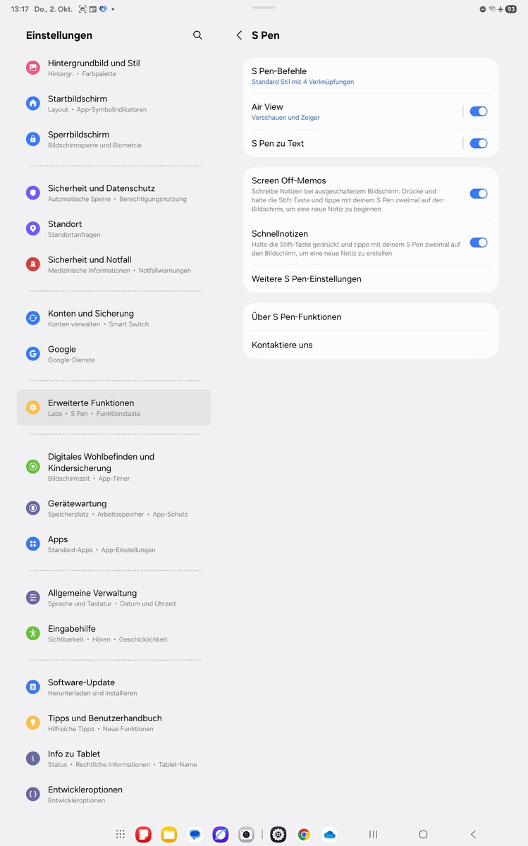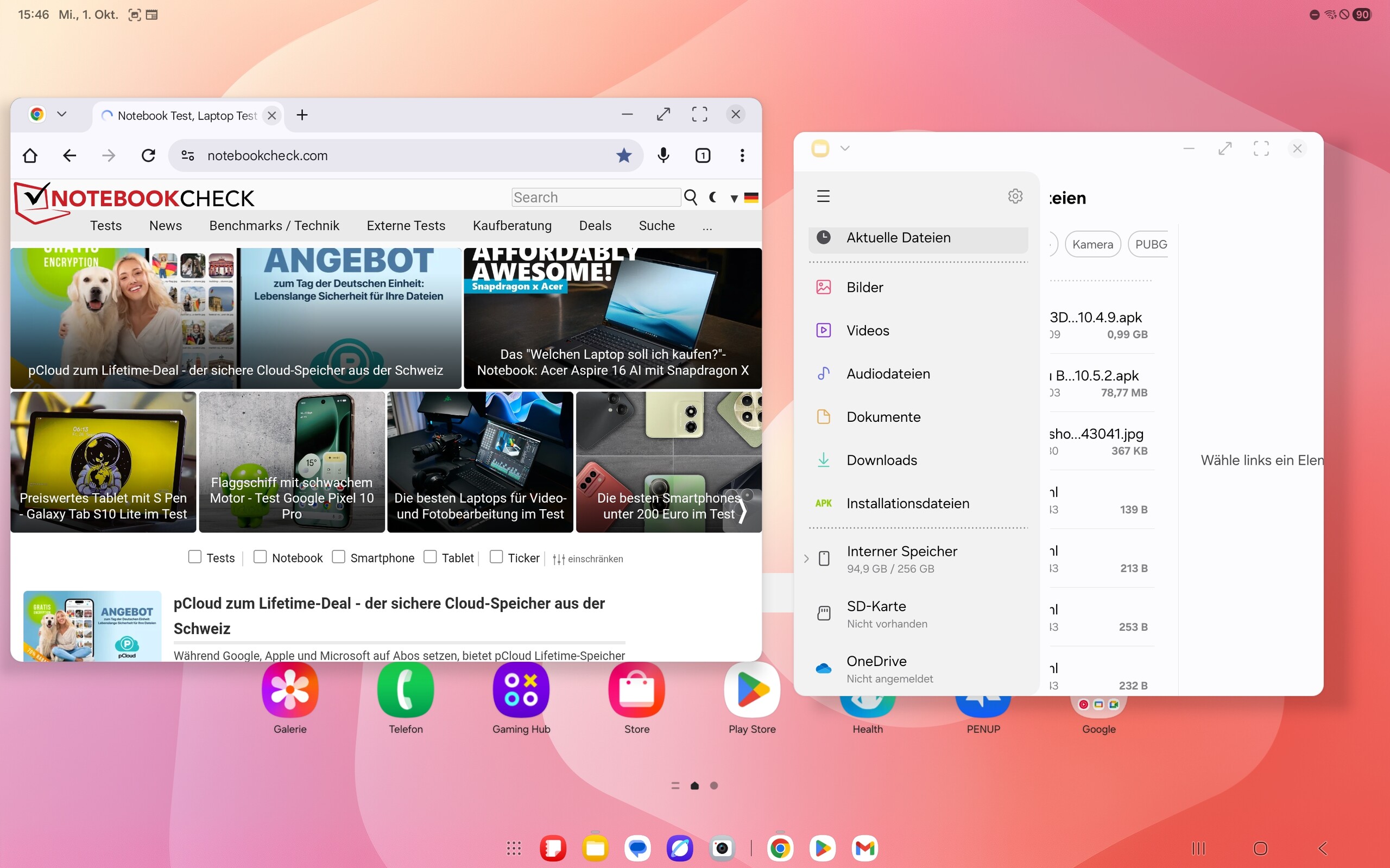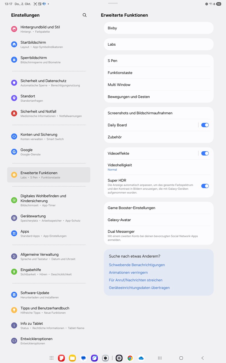 Samsung has significantly revamped the DeX mode. It can still be projected onto an external display via cable or wirelessly, but it can now also be used to its full extent directly on the tablet. Switching between conventional tablet mode and DeX mode can be done with a simple swipe gesture, allowing windows and apps to be resized and positioned as desired. This is complemented by the support of up to four desktops.
