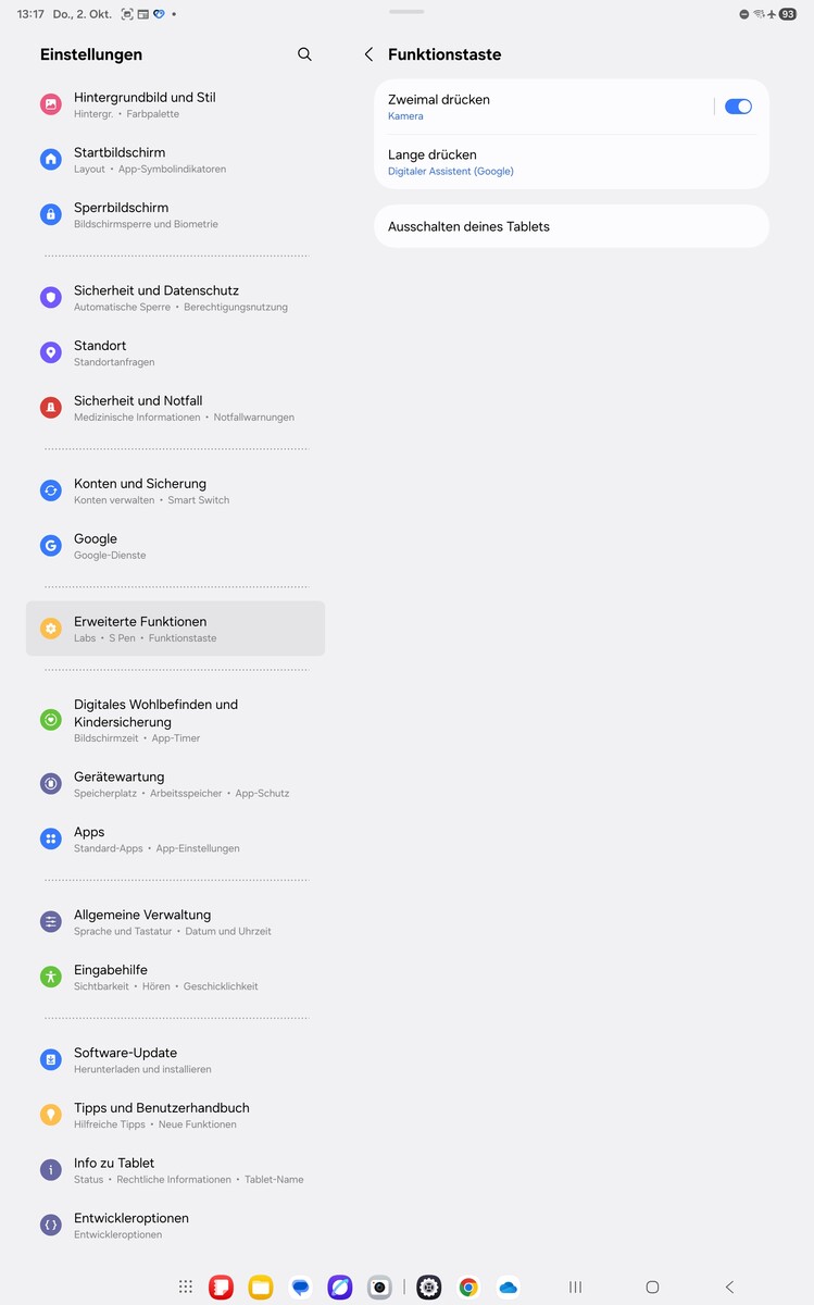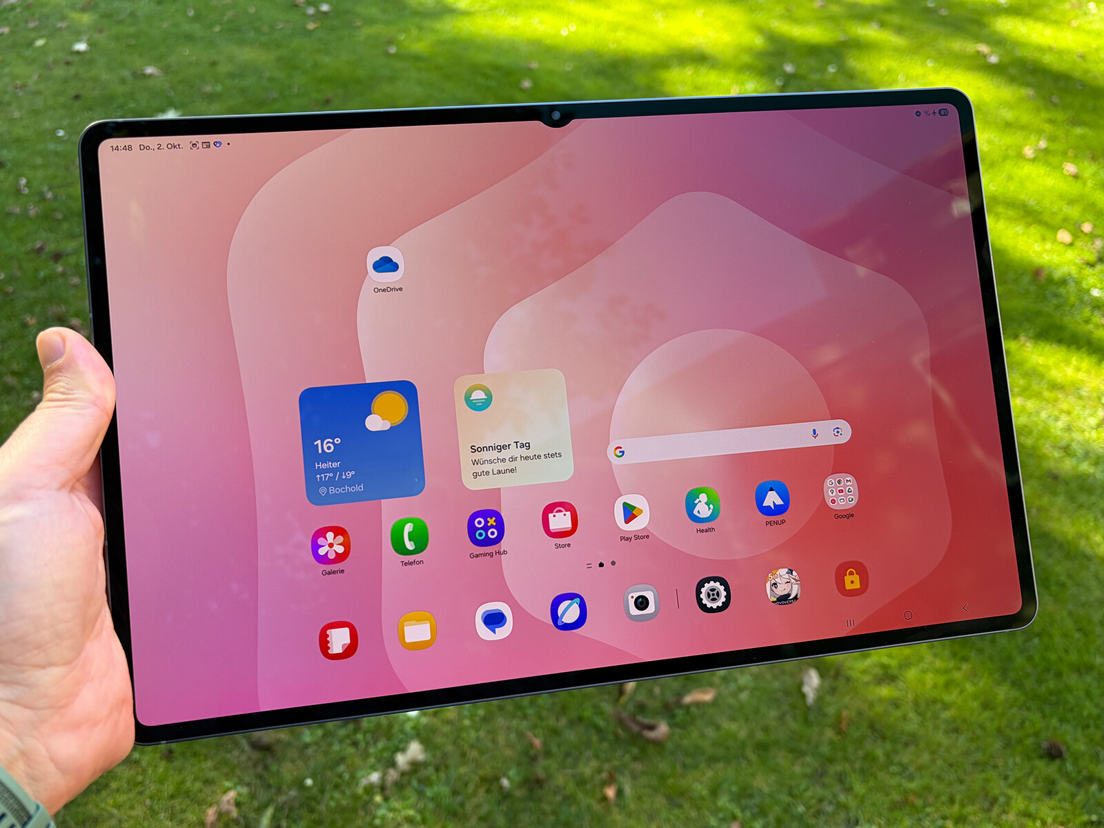 For biometric security, an optical fingerprint sensor has been integrated into the display. This is located on the shorter right side of the Galaxy Tab S11 Ultra and is most easily accessible in landscape format. However, if you use the tablet upright, then you'll have to adjust your grip. In addition or as an alternative, users can make use of facial recognition via the front camera, which is less secure but works super reliably in good lighting conditions.