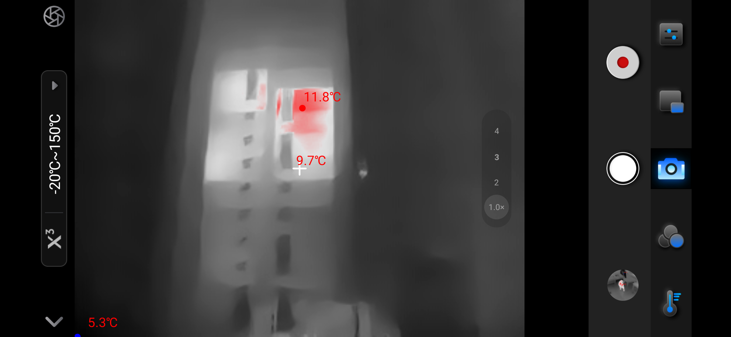 The fixed (infinite) focus is a major workflow advantage. Unlike the manual focus found in the P3, the P1 instantly provides a clear thermal image, allowing for quick, single-handed inspections without the need to adjust a focus ring. While not ideal for those looking to get up close on a subject, this feature largely removes focal ambiguity and helps speed up the entire testing process. While shooting wide spaces, the P1 delivered a sufficient amount of detail for its lower-resolution sensor and was able to detect temperature differences at various distances. As mentioned, the app also features several tools to customize the P1's temperature measurement across a subject, including the rectangle tool.