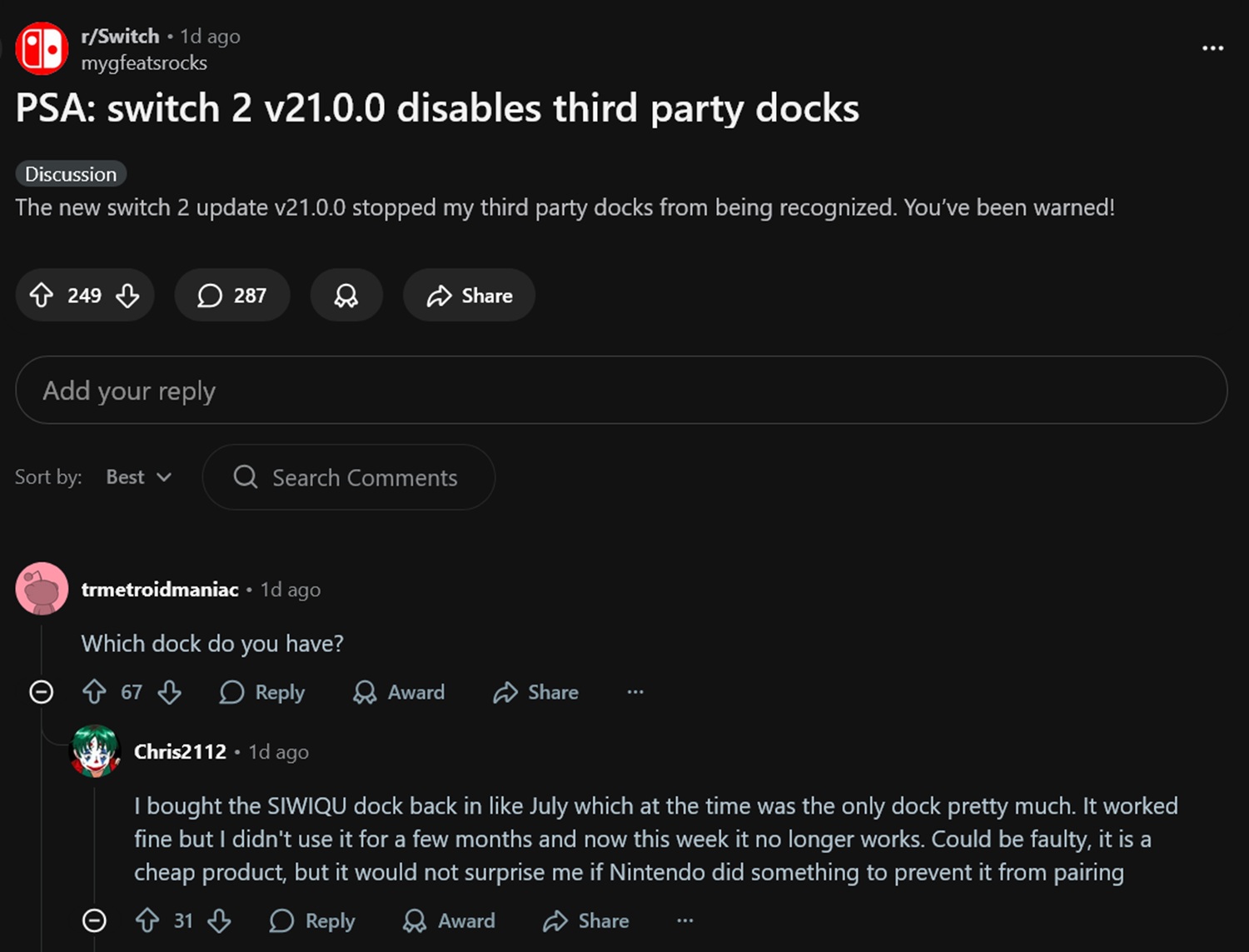 In one example posted on Reddit, a popular Switch 2 dock from Siwiqu was affected. Chris2112 explains that he purchased the dock in July and had no issues. Sadly, several months later, that is no longer the case. The gamer suspects that Nintendo’s latest firmware update is to blame, a claim backed up by several other readers.