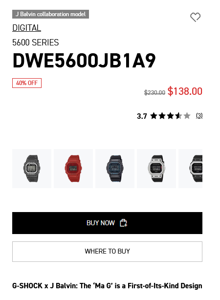 When Casio’s collaboration watch with Colombian artist J Balvin dropped back in Jan 2025, fans liked the design and accessory choices, but criticized its high price point, especially for a 5600-series module. More than a year later, the watch just got a big price drop. The G-Shock DWE5600JB1A9, originally listed at $230, is now discounted by 40% to $138 - that's almost a $100 discount.