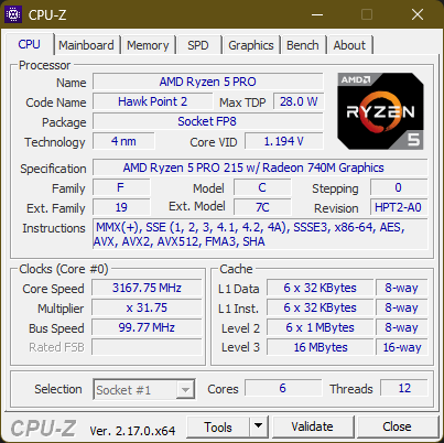 The AMD Ryzen 5 Pro 215 is a six core CPU with 12 threads thanks to SMT. This Zen4 "Hawk Point" chip is the weakest six core CPU of the lineup, with clock rates of 3.2 to 4.7 GHz . Uniquely, it does not have any NPU. Further benchmark comparisons are possible with our CPU benchmark list.