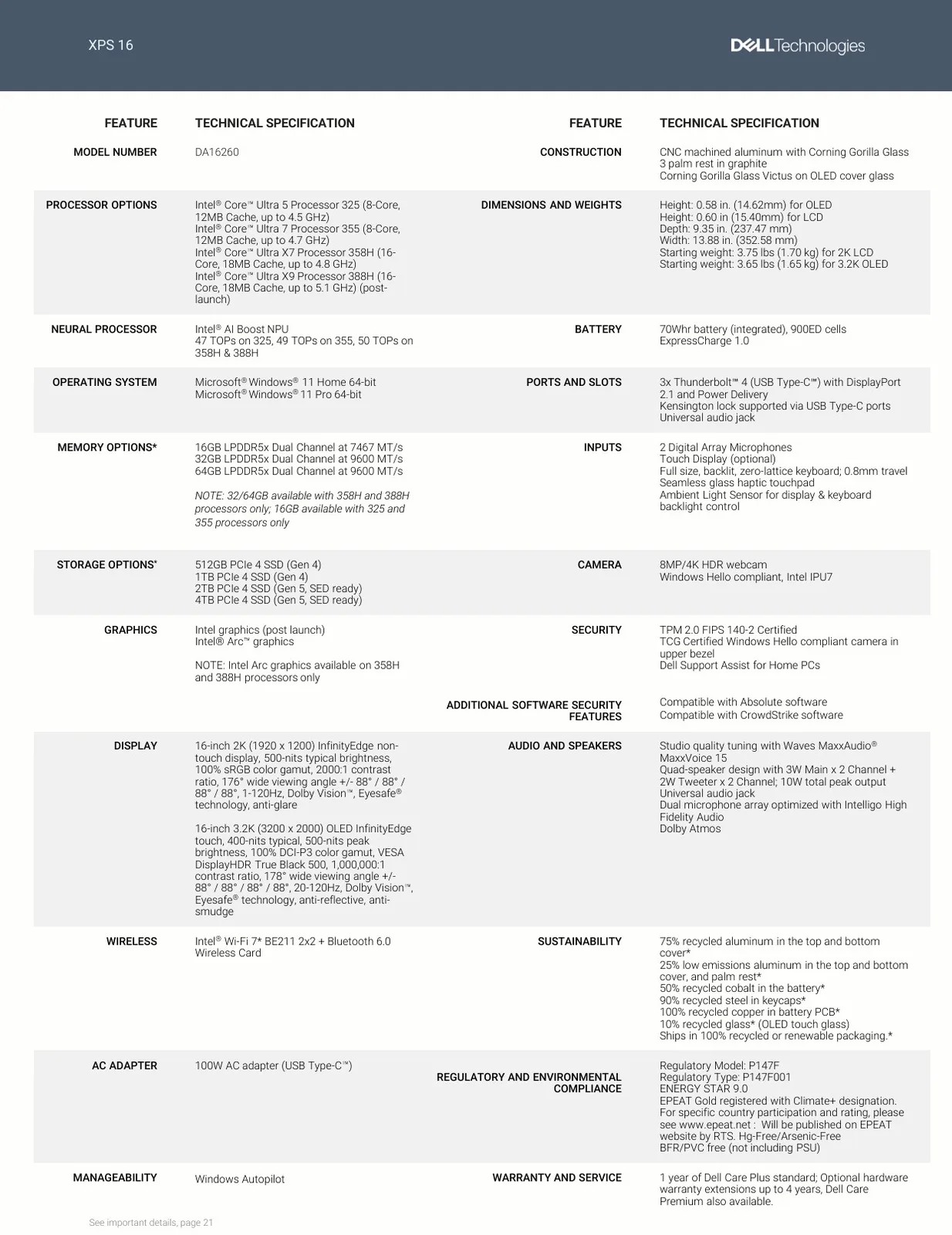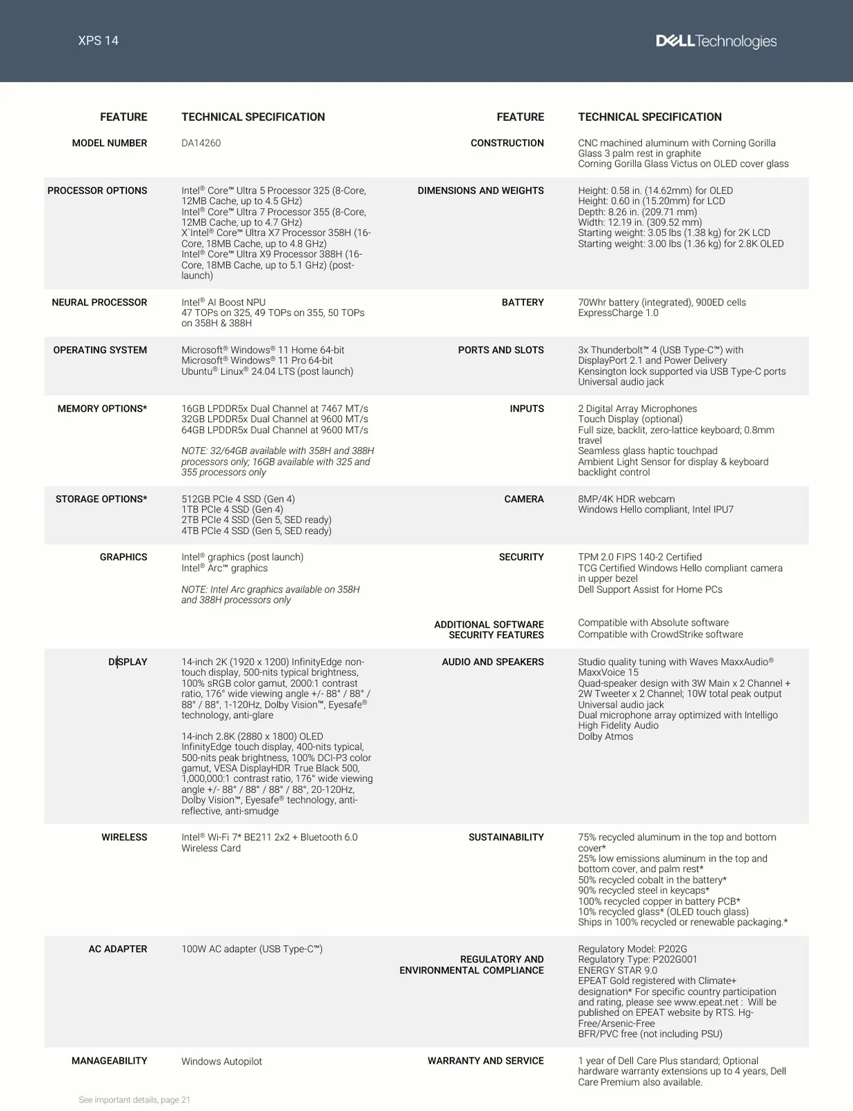 Of course, as 2026 laptops, the new Dell XPS 14 and Dell XPS 16 are powered by processors of the newest generation. In this case, Intel's Panther Lake CPUs, which includes both basic 8-core versions (Intel Core Ultra 5 325, Core Ultra 7 355) and the much more powerful H class CPUs (Intel Core Ultra X7 358H, Core Ultra X9 388H), with the Core Ultra X7 and X9 including Intel's latest ARC Graphics - dedicated GPUs are not available. Up to 64 GB of soldered LPDDR5X memory are available, SSD storage ranges up to 4 TB.