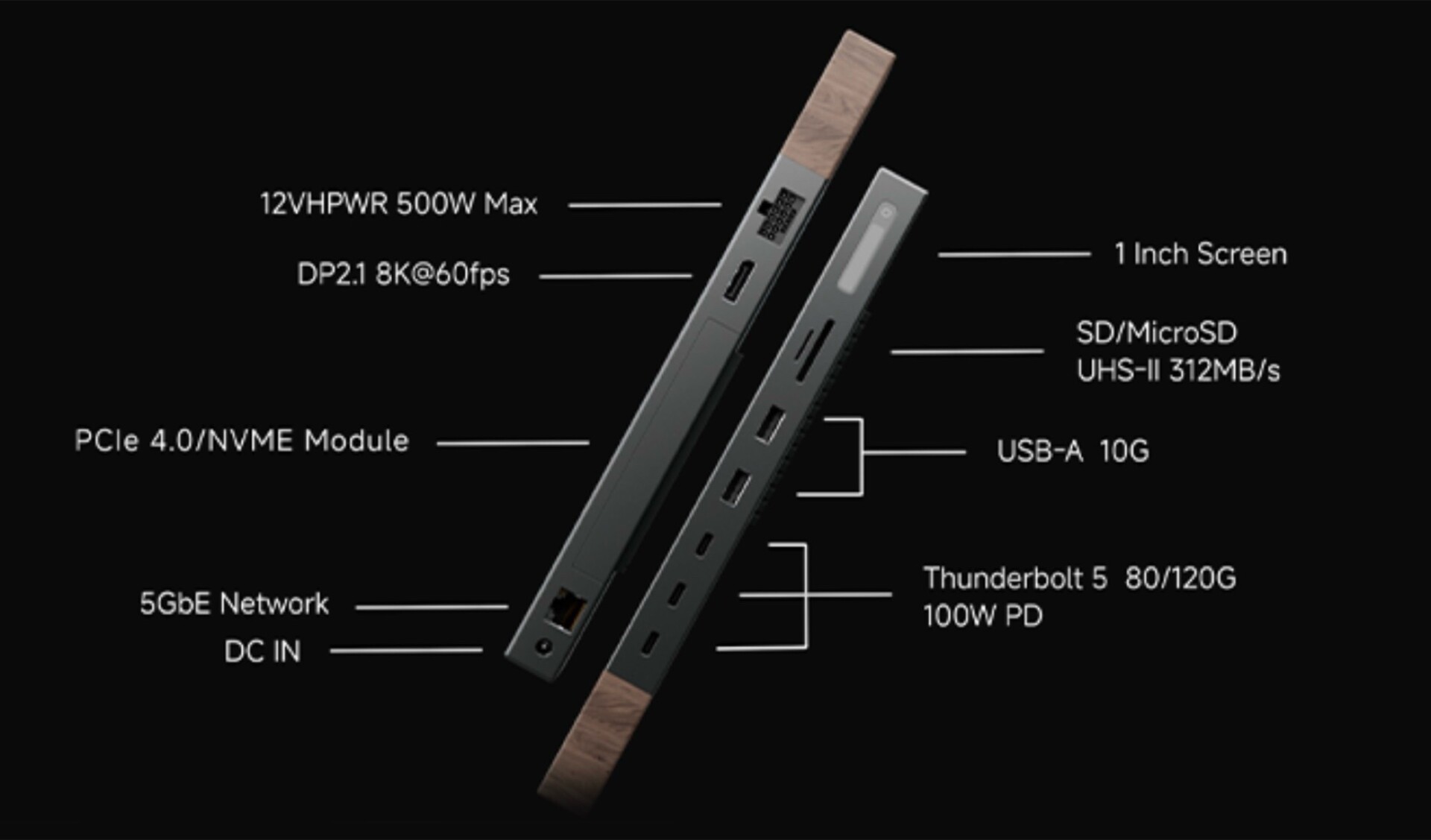 The TB5 dock also includes two USB-A ports (10Gbps), Ethernet (5Gbps), DisplayPort 2.1 with support for an 8K monitor at a refresh rate of 60Hz, an SD and a microSD card reader, as well as an M.2 slot that can be used to expand the dock with an SSD. Charging coils are hidden inside the part of the dock that features a wooden look, and they can wirelessly charge smartphones and also an Apple Watch (from $229 on Amazon).