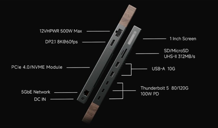 Connected laptops can charge at up to 100 watts, while a 1-inch display shows the dock's current status. The most unusual feature is arguably the hidden PCIe slot under the cover on the top that allows the user to connect a regular desktop GPU in conjunction with a 500-watt PSU. The graphics card connects via PCIe 4.0 x4.