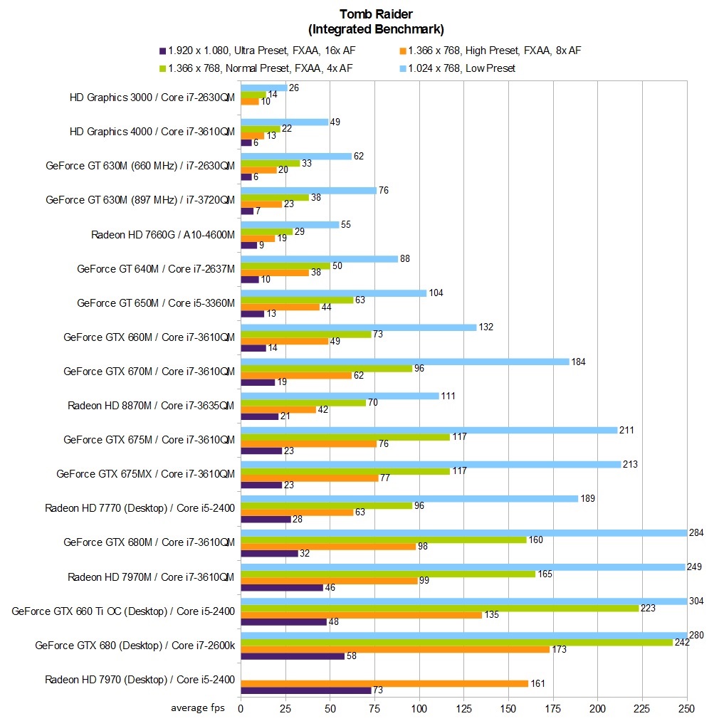 As a glance at the benchmark table will tell you, AMD takes a significant lead when the game is at maximum settings (Tomb Raider is part of their own "Gaming Evolved" program). For example the Radeon HD 8870M: With 21 FPS the DirectX 11.1 GPU comes in before the GeForce GTX 670M, though the GeForce model generally does much better than the Radeon (compare the same test on the Samsung Chronos 770Z7E). We assume that Nvidia will optimize the driver in the coming months.