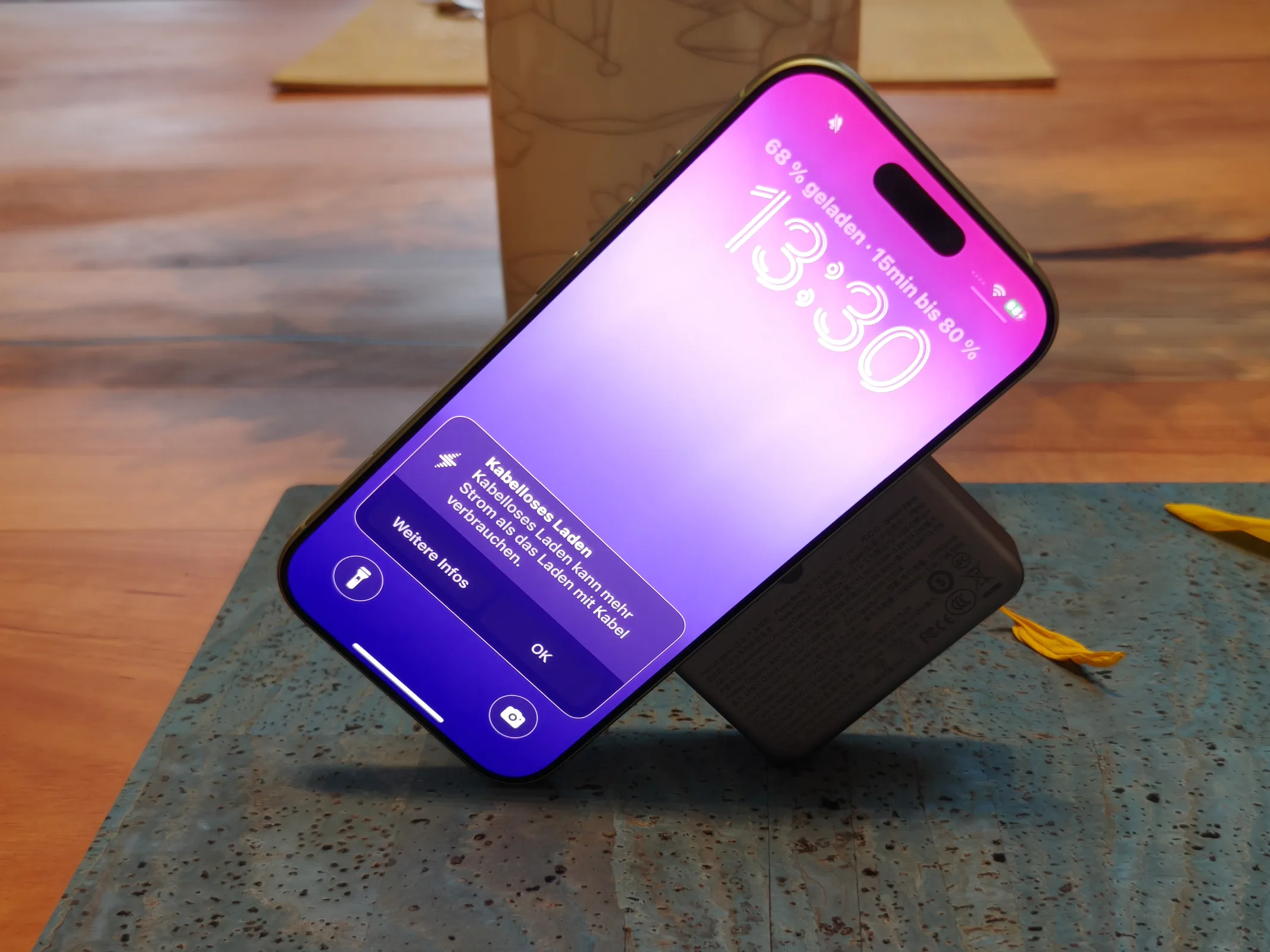 The manufacturer claims to use selected battery cells and multiple safety mechanisms to keep the device protected. Four LEDs on the back show the current charge level. As for charging: it supports up to 30 watts via cable and up to 15 watts wirelessly. A full charge takes about 2.5 hours wired and roughly 4 hours wirelessly.