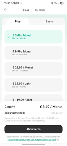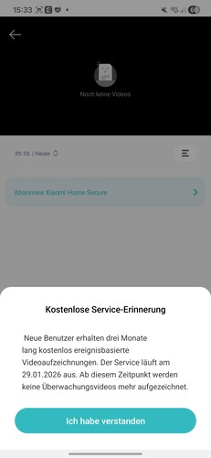 A subscription to Xiaomi Home Secure is required for AI features such as object detection and tracking. Three months of free access are included with the purchase. After that, the Plus plan, which provides 30 days of cloud storage, costs €3.50 per month or €33 per year. Local storage on internal memory or a microSD card is free, with older footage overwritten automatically.