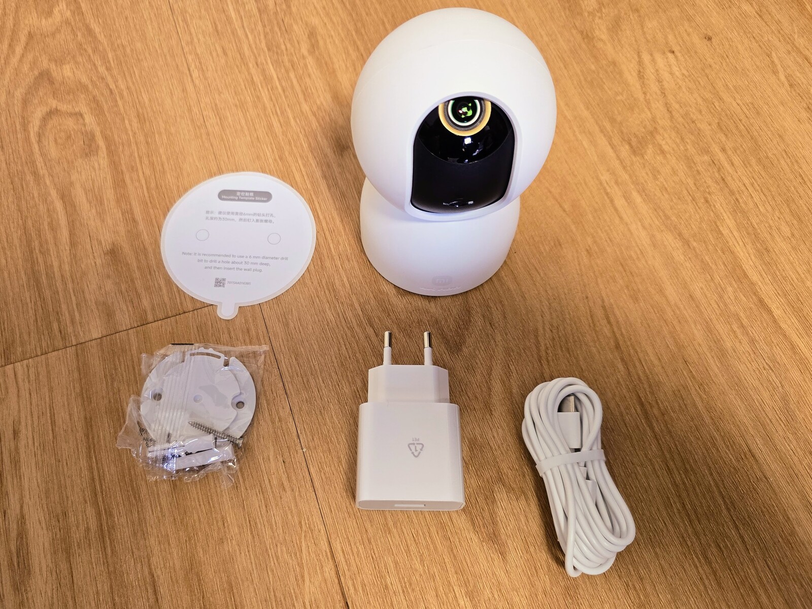 The scope of delivery for the Smart Camera C701 is straightforward. In addition to the camera itself, the box includes a USB cable and a power adapter. The manufacturer also provides a template for wall or ceiling mounting.
