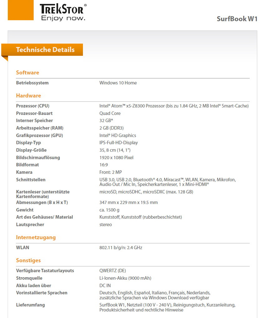 The subnotebooks are essentially identical in hardware and will only have software differences. The SurfBook W1 ships with Windows 10 Home 32-bit while the W2 will have the 64-bit equivalent. Both the W1 and W2 will be available in Germany and other European regions before the end of this year for 250 Euros and 350 Euros, respectively. Unfortunately, no other processor options are available outside of the Cherry Trail Atom SoC. A proper ULV Core ix, for example, could have boosted the overall performance of the subnotebook.