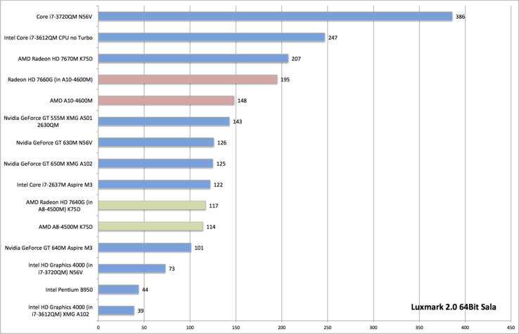 In comparison, the tested Nvidia GPUs performed poorly in Luxmark as even the GT 650M loses out to the 7660G. The Intel HD Graphics 4000 in Ivy Bridge quad-core processors is even further behind and gets outperformed by weaker GPUs such as the Radeon HD 7640G in the A8-4500M.