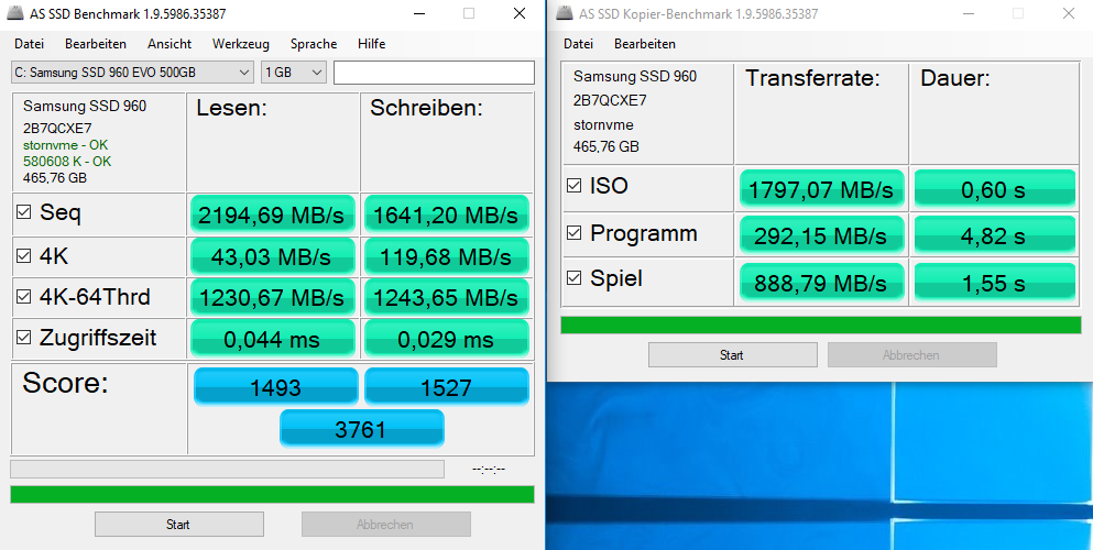 | Tuxedo InfinityBook Pro 13 2017 UHD Graphics 620, i5-8550U, Samsung SSD 960 Evo 500GB m.2 NVMe | Tuxedo InfinityBook Pro 13 N130BU HD Graphics 620, i7-7500U, 2x Samsung SM961 MZVPW256HEGL NVMe (RAID 0) | Tuxedo InfinityBook 13 v2 HD Graphics 520, 6500U, Samsung SSD 950 Pro 256GB m.2 NVMe | HP Envy 13-ad006ng GeForce MX150, i7-7500U, Toshiba NVMe THNSN5256GPUK | Dell XPS 13 i7-8550U UHD Graphics 620, i5-8550U, Toshiba XG5 KXG50ZNV256G | HP Spectre 13-v131ng HD Graphics 620, i7-7500U, Samsung PM961 NVMe MZVLW512HMJP | |