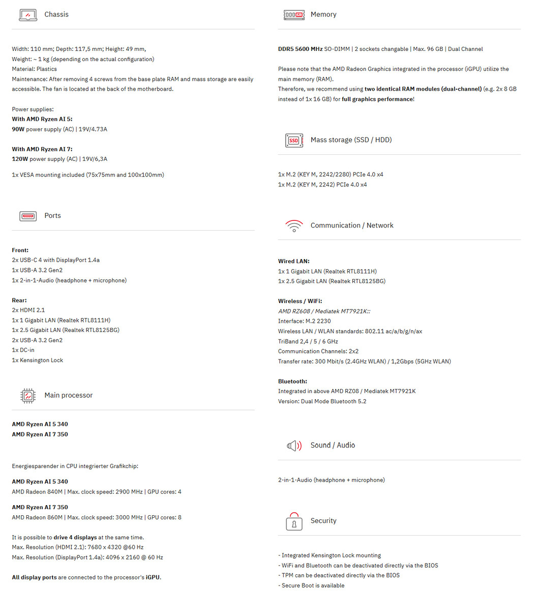 More specifically, Tuxedo notes that the Nano Pro Gen 14 measures 110x117.5x49 mm, and it's also said to be pretty lightweight, coming in at 1 kg. There's a decent selection of connectivity ports available as well, including: