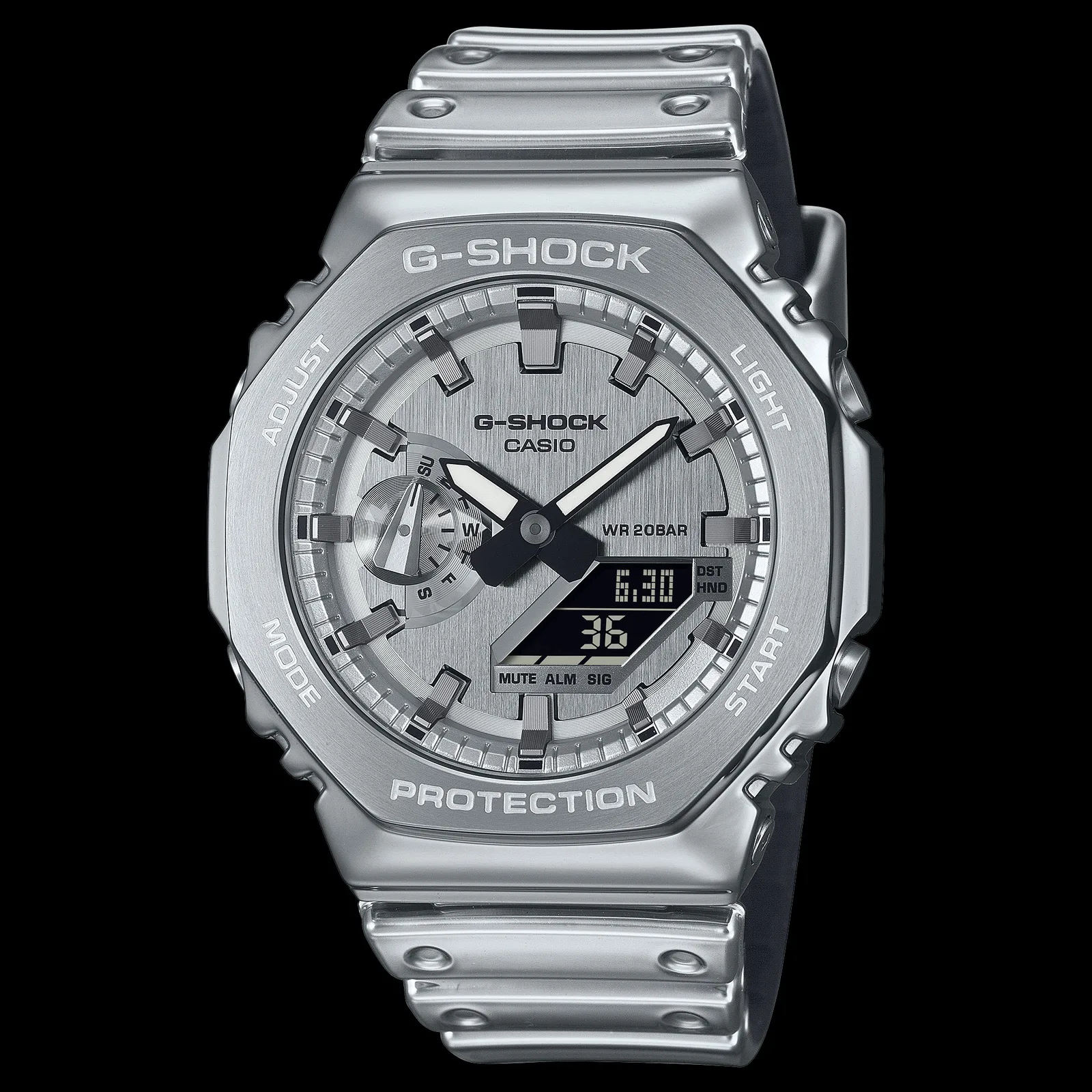 The GM2100YM-8A comes in a silver finish with a stainless-steel bezel over a resin inner case and a tough silicone band. Case size is 49.3 × 44.4 × 11.8 mm, and weight is 84 g. It gets you 200 m water resistance, mineral glass, shock resistance, world time (31 time zones, 48 cities), 1/100-second stopwatch, 24-hour countdown timer, five daily alarms, hourly signal, and double LED backlight. Battery life is rated at roughly three years on two SR726W cells.