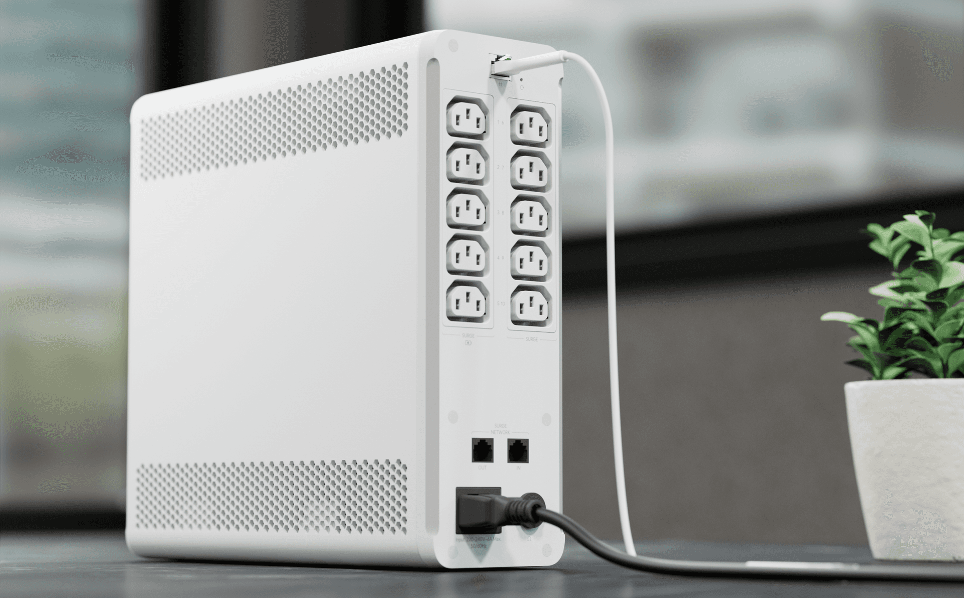 The Unifi UPS Tower is designed to be put on desktops. In addition to a network port for Unifi integration and surge protection for network connections via GbE, the tower offers a total of ten C13 ports for C14 plugs. All ports are surge-protected, and five of these ports are additionally backed up by the internal battery for a continuous power supply.
