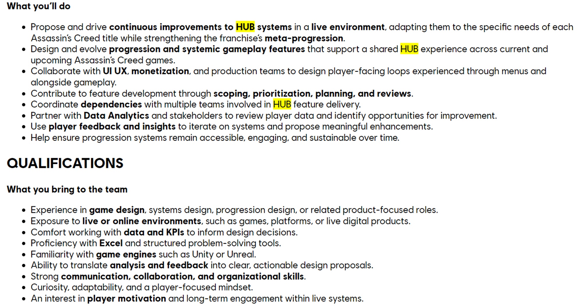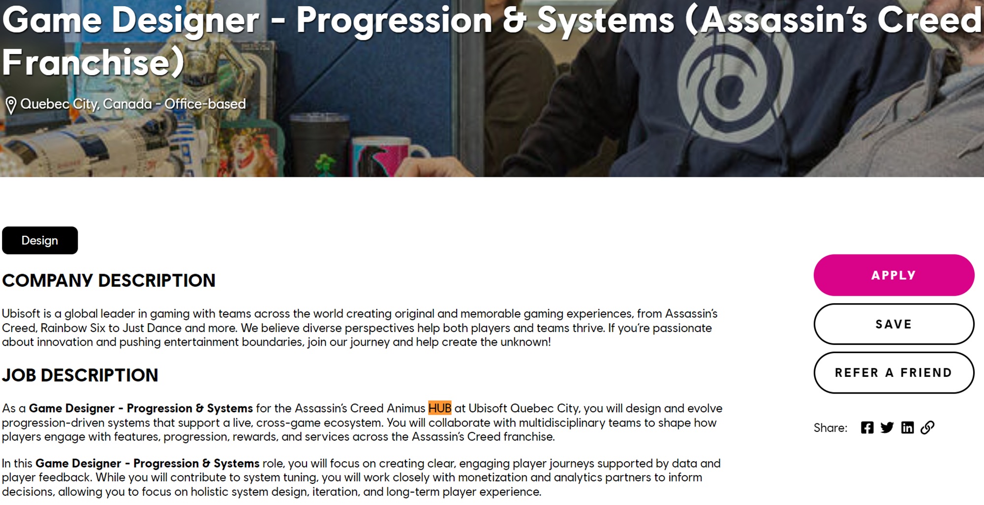 Based in Quebec City, the developer would optimize Progression and Systems in Assassin's Creed games. Referencing the Animus Hub launcher, which connects multiple titles, the job ad calls for “continuous improvements to HUB systems in a live environment.”