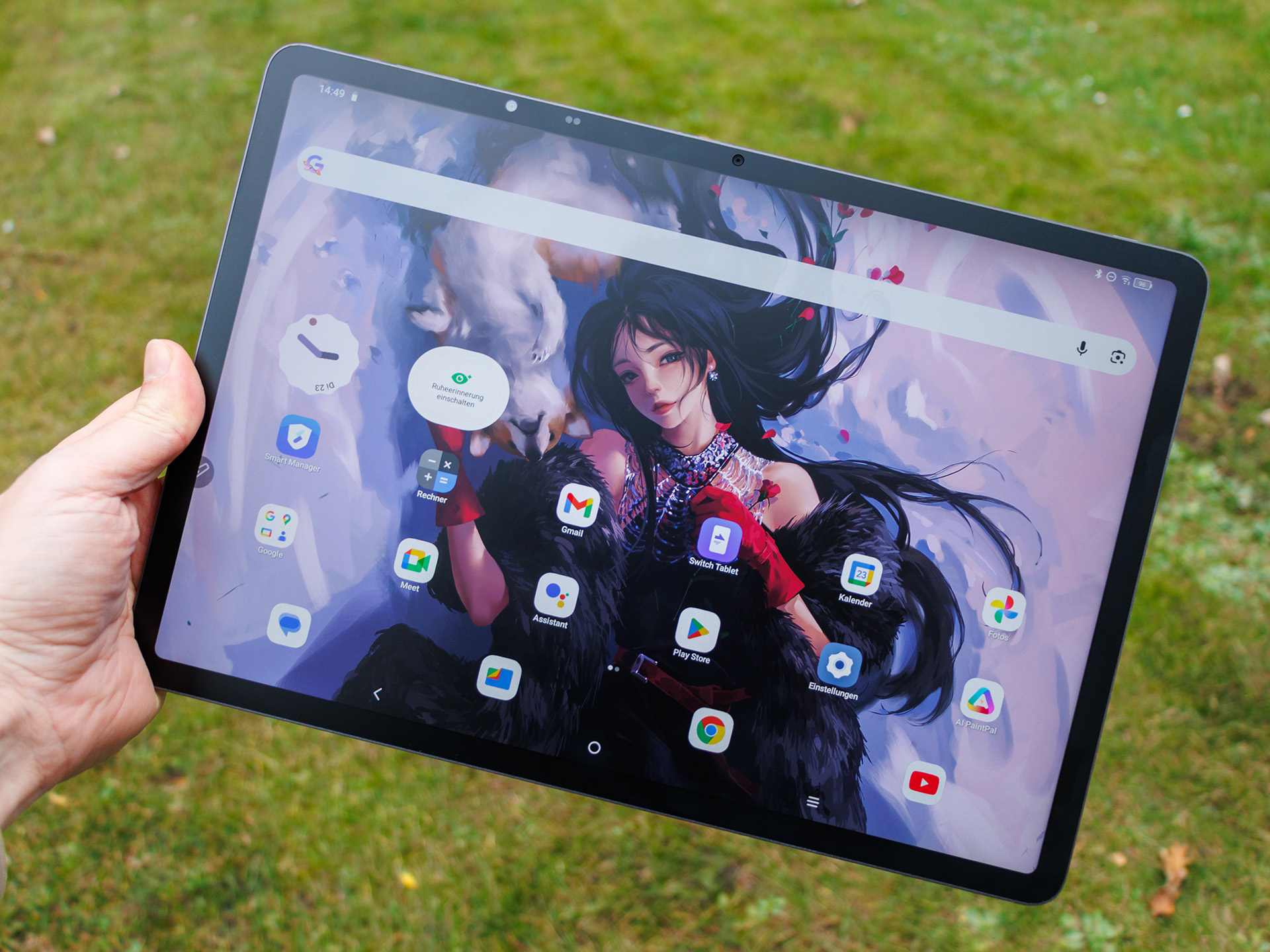 The aluminum casing appears robust and high-quality, although the sharp edges become somewhat uncomfortable during prolonged use. At 760 grams, the tablet is not exactly lightweight, but it feels stable and torsion-resistant in the hand. The camera unit in the center of the back limits wobbling on the table, but in practice only delivers average results: sufficient for video conferencing, but hardly convincing for photos.