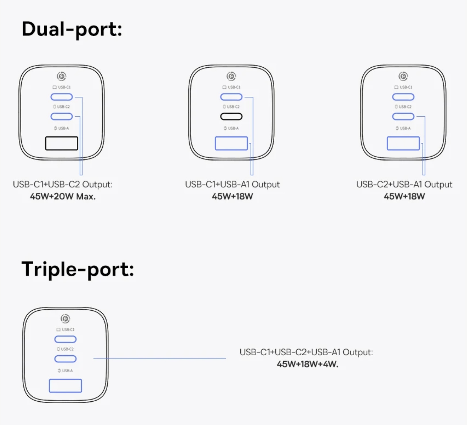 The charger packs a total of three output ports, consisting of dual USB-C and a single USB-A port. The two USB-C ports can output the advertised 67 watts, while the USB-A port can only do a maximum of 33 watts. When the two USB-C ports are used at once, output is limited to 45 watts and 20 watts respectively. The detailed dual-port and triple-port output details can be inferred from the image attached below.