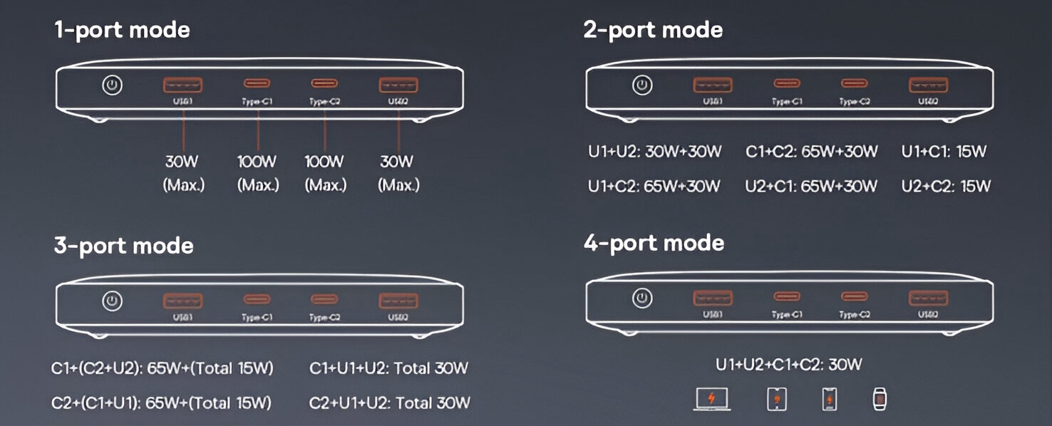 However, when using all the four ports at once, the peak output does drop to just 30 watts, which is extremely low. The port setup consists of dual USB-A and dual USB-C ports, with the USB-A ports capable of outputting 30 watts at a time, while the USB-C ports can do the advertised 100 watts. Needless to say, when multiple ports are used at once, the output varies greatly. For a detailed understanding of the same, kindly refer to the following image.