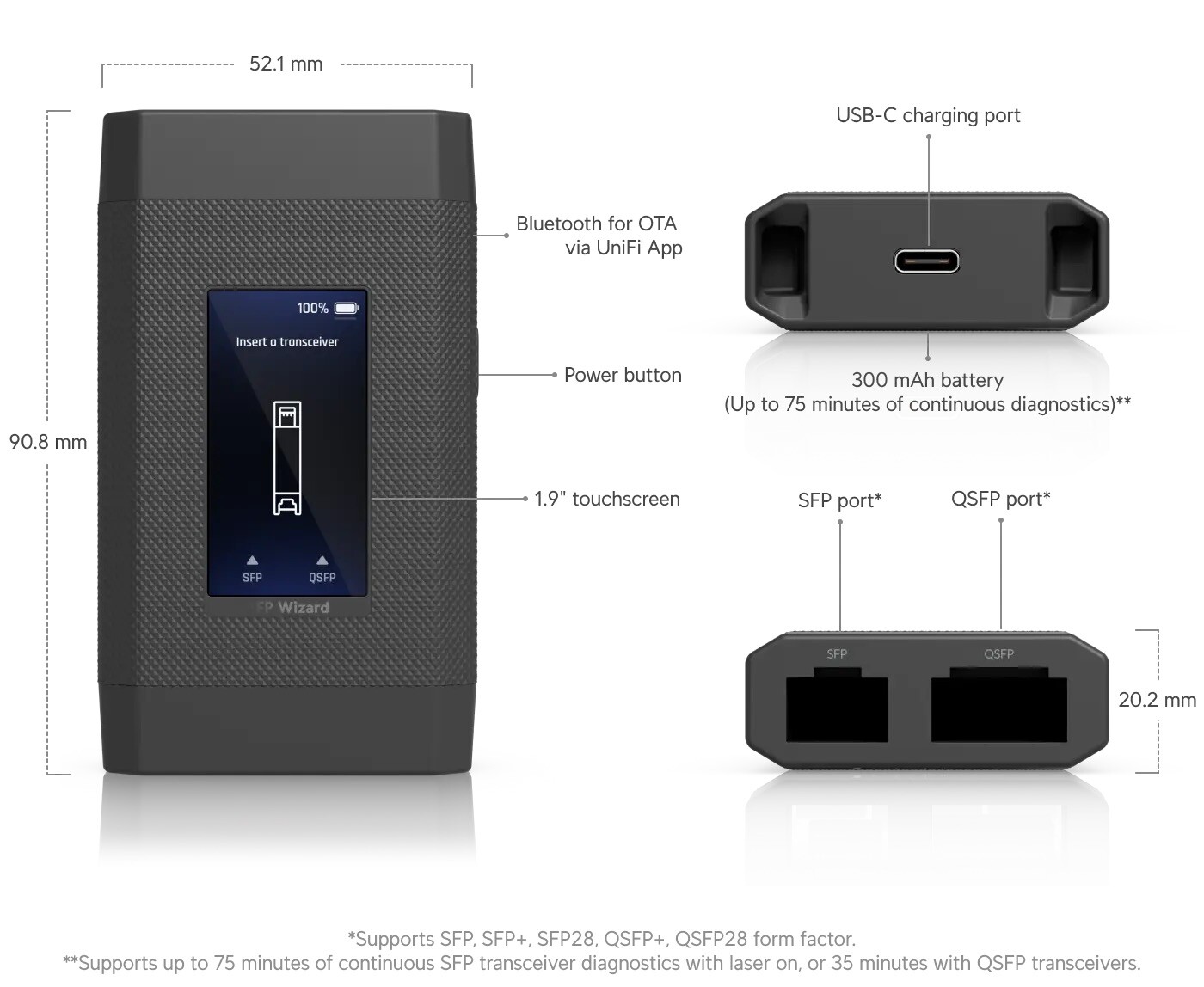 The device allows users to prepare SFP and larger QSFP modules for use with other switches. In order to do so, the SFP Wizard includes two module slots of corresponding sizes. According to Ubiquiti, its 1.1Wh battery has a runtime of 75 minutes without external power. A touchscreen can be practical when programming the module. Measuring about 2 x 3.5 inches and weighing 3 oz, the device is compact enough to fit into most pockets.