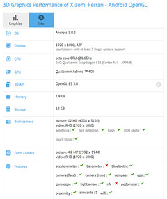 According to the leaked benchmark result, the Xiaomi Ferrari will draw its processing power from a 64-bit Qualcomm Snapdragon 615 chipset, a mobile SoC that integrates a 1.65GHz quad-core ARM Cortex A53 CPU and an Adreno 405 GPU. The display is listed as measuring 4.9 inches across the diagonal and it apparently runs a resolution of 1920 by 1080 pixels (Full HD). Other specs listed in the benchmark are 2GB of RAM, 12GB of free storage space (probably out of a total of 16GB), a 12MP primary camera, and a 4.8MP front-facing shooter. GFXBench doesn't mention LTE support, but the Snapdragon 615 is an LTE-ready chip, and we see no reason why Xiaomi would limit the connectivity of its upcoming smartphone.