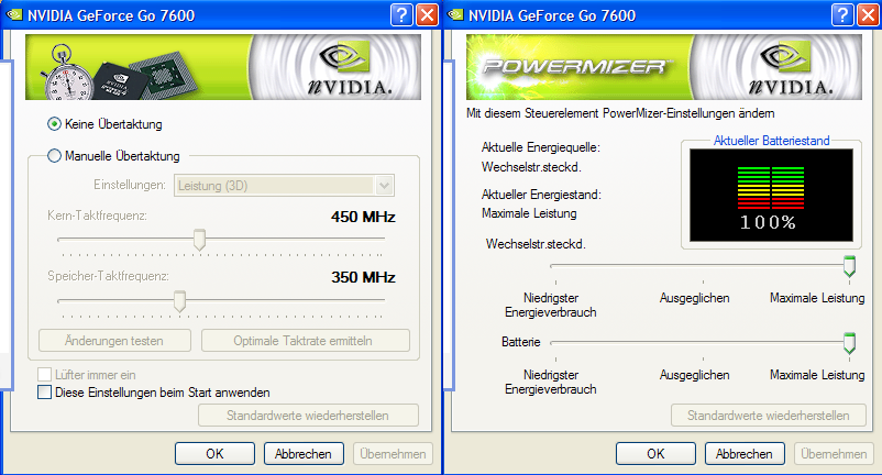 (LCD max, CPU min, nVidia PowerMizer: balanced, Cyberlink PowerDVD 6 Deluxe