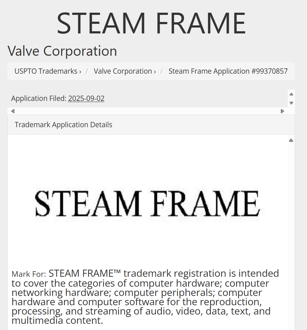 Distinct from any other recent rumours, the question was initially dismissed by r/SteamDeck members. However, Valve has now been spotted applying for a new trademark using that exact name with the United States Patent and Trademark Office (USPTO). As the screenshot below shows, Valve hopes to trademark the term 'Steam Frame', which the company hopes to cover the following categories: