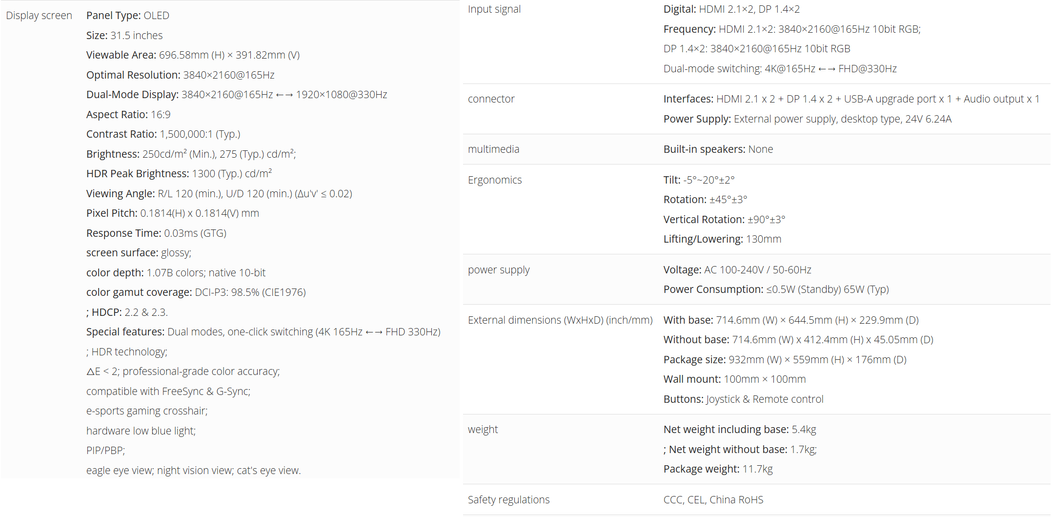 Other highlights of the OLED gaming monitor include 98.5% DCI-P3 color coverage, 0.03 ms rated GTG response time, and an HDR brightness rating of 1,300 cd/m². The company has yet to share details on pricing and availability, but given that the complete spec sheet is already available, the XG323B-4K-OLED could make a proper launch soon.