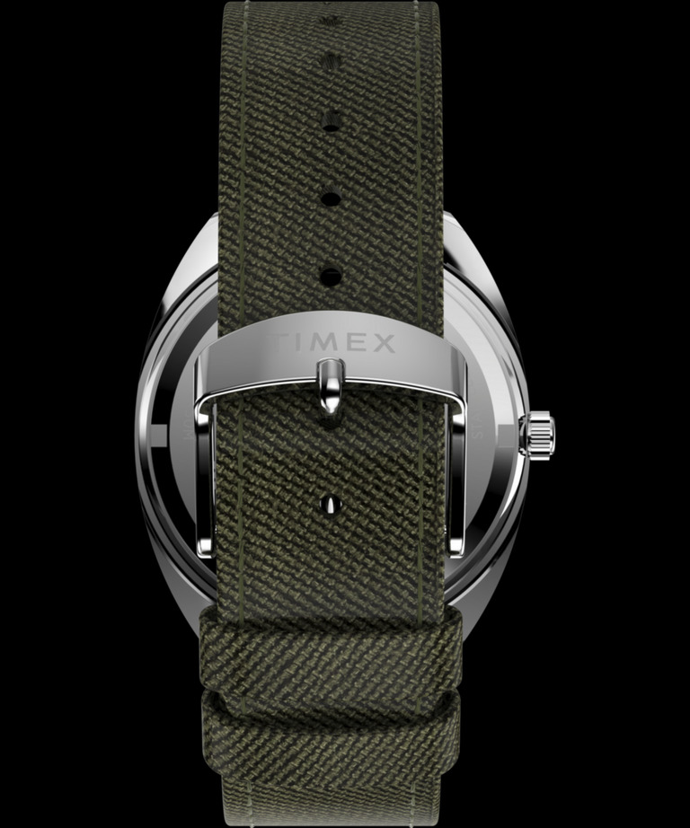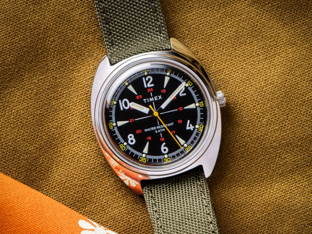 Timex and Bespoke Post have restocked their limited-edition field watch, which was originally launched in April 2025. The 36mm quartz timepiece is essentially a reinterpretation of the 1970s Timex Viscount design, with a stainless steel barrel-shaped case, domed acrylic crystal for vintage distortion, luminous hands and markers, Arabic numerals, a red 24-hour inner track, yellow minute markers, and an orange seconds hand. It provides 50m water resistance and comes on an 18mm olive Cordura strap featuring leather lining and quick-release spring bars.