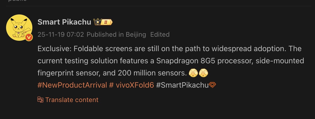 Writing on Weibo, tipster Smart Pikachu suggests that the Vivo X Fold 6 will be powered by the Qualcomm Snapdragon 8 Gen 5. This is a new sub-flagship processor that will make its debut later this month with the OnePlus Ace 6T. A recent Geekbench 6 CPU test revealed scores of 2,981 in single-core and 10,136 in multi-core, suggesting a notable performance improvement over the Vivo X Fold 5's Snapdragon 8 Gen 3 chipset.