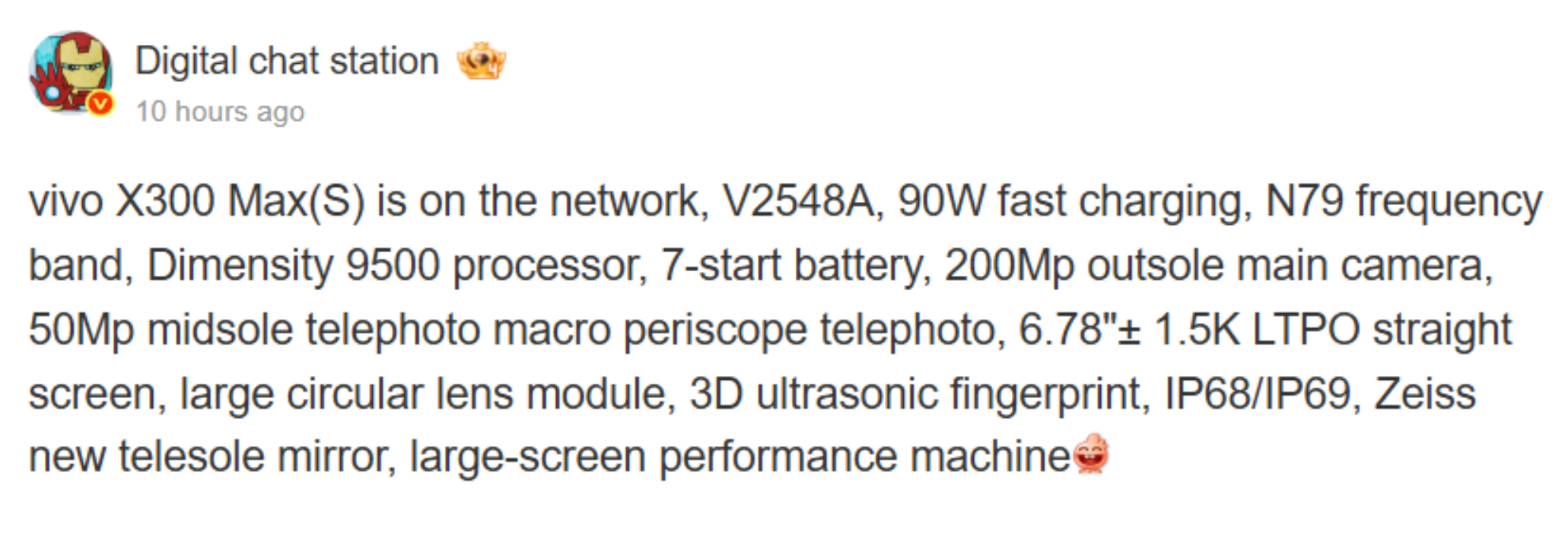 Instead, the leaker focuses on the X300 Max, which the 3C reveals supports 90 W fast charging like the X300 and X300 Pro before it. Additionally, Digital Chat Station claims that Vivo has complemented this charging capability with a circa 7,000 mAh battery and MediaTek's Dimensity 9500 chipset. Other highlights include a 6.78-inch and 1440p LTPO OLED display, Zeiss optics and IP certification. A release date remains unclear for now, though.
