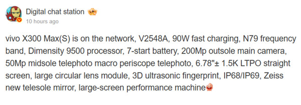 Now, Vivo has certified the X300 Max in China ahead of its release in Vivo's home market. Bearing the model number V2548A, the X300 Max should slot in above the X300 and rumoured X300e but below the X300 Pro and X300 Ultra. Digital Chat Station indicates that there could be a second X300 Max variant too; details about this model remain unknown for now, though.