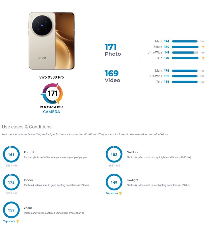 For example, the photo score of 171 points compared to 173 for the Vivo X200 Ultra shows that Vivo's current Ultra flagship still maintains the upper hand in that category. However, the video score has improved dramatically, as the Vivo X300 Pro receives 169 points compared to 156 for the Vivo X200 Ultra. In the video discipline, the Vivo X300 Pro even takes second place directly behind the iPhone 17 Pro, so it’s currently the best Android phone for recording video according to DxOMark.