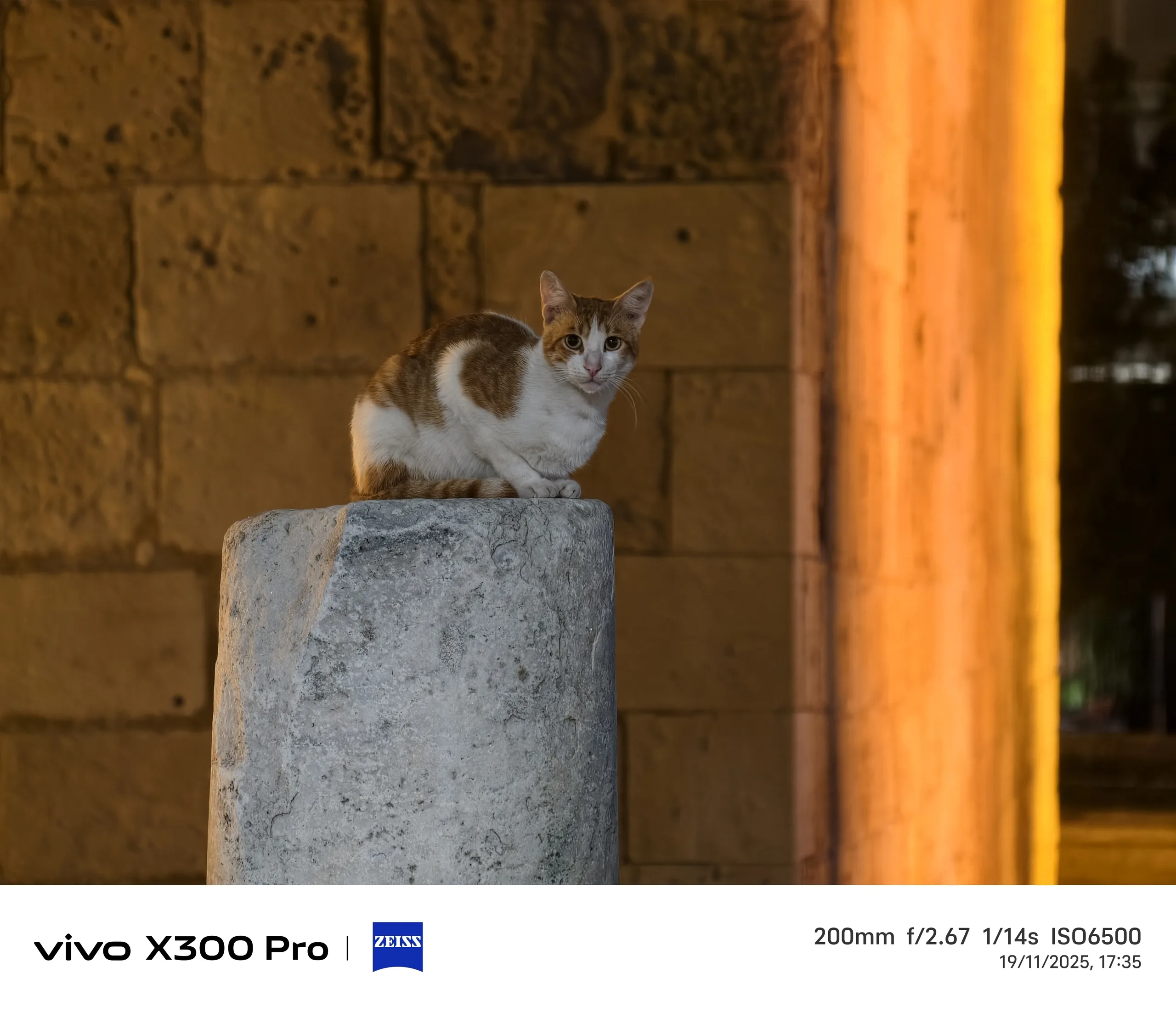 I surprisingly had better experiences with the Vivo X300 Pro's teleconverter in even darker situations, likely because I was able to stabilize the lens on the railing of the Lemesos Castle in Limassol to photograph the cat that had made itself comfortable on the ancient column but unfortunately did not stay in one position.
