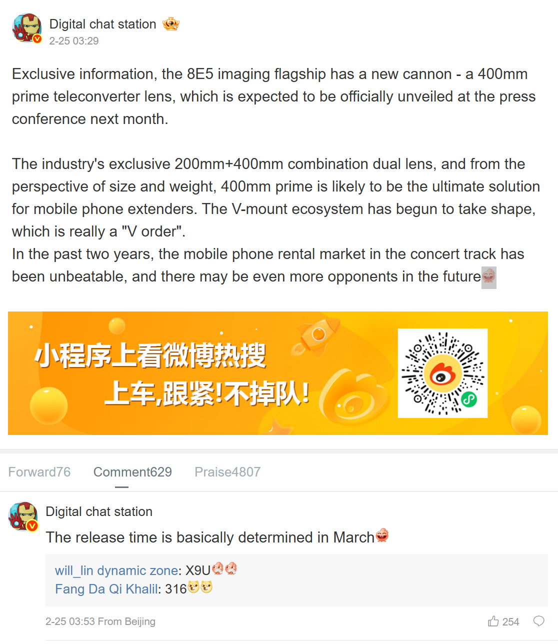Additionally, Digital Chat Station has suggested that the Vivo X300 Ultra will also be joined by a new teleconverter accessory that takes in two equivalent focal lengths. Writing on Weibo, the leaker asserts that the accessory will support 200 mm and 400 mm modes to complement the expected 85 mm telephoto included inside the X300 Ultra.