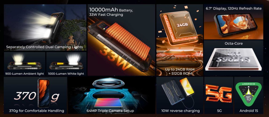 Either way, the Oukitel smartphone is equipped with a 10,000mAh battery that can be charged with up to 33 watts. It also supports 10W reverse charging, so it can be used like a power bank. Moreover, the WP58 Pro is powered by an SoC with eight cores and 5G support, so it’s not limited to 4G LTE like some other cheap rugged smartphones. The remaining specs include 8GB RAM, while the 512GB mass storage is also reasonably sized. The phone runs on Android 15 out of the box, and users can expand the storage via microSD by sacrificing one of the dual SIM card slots.