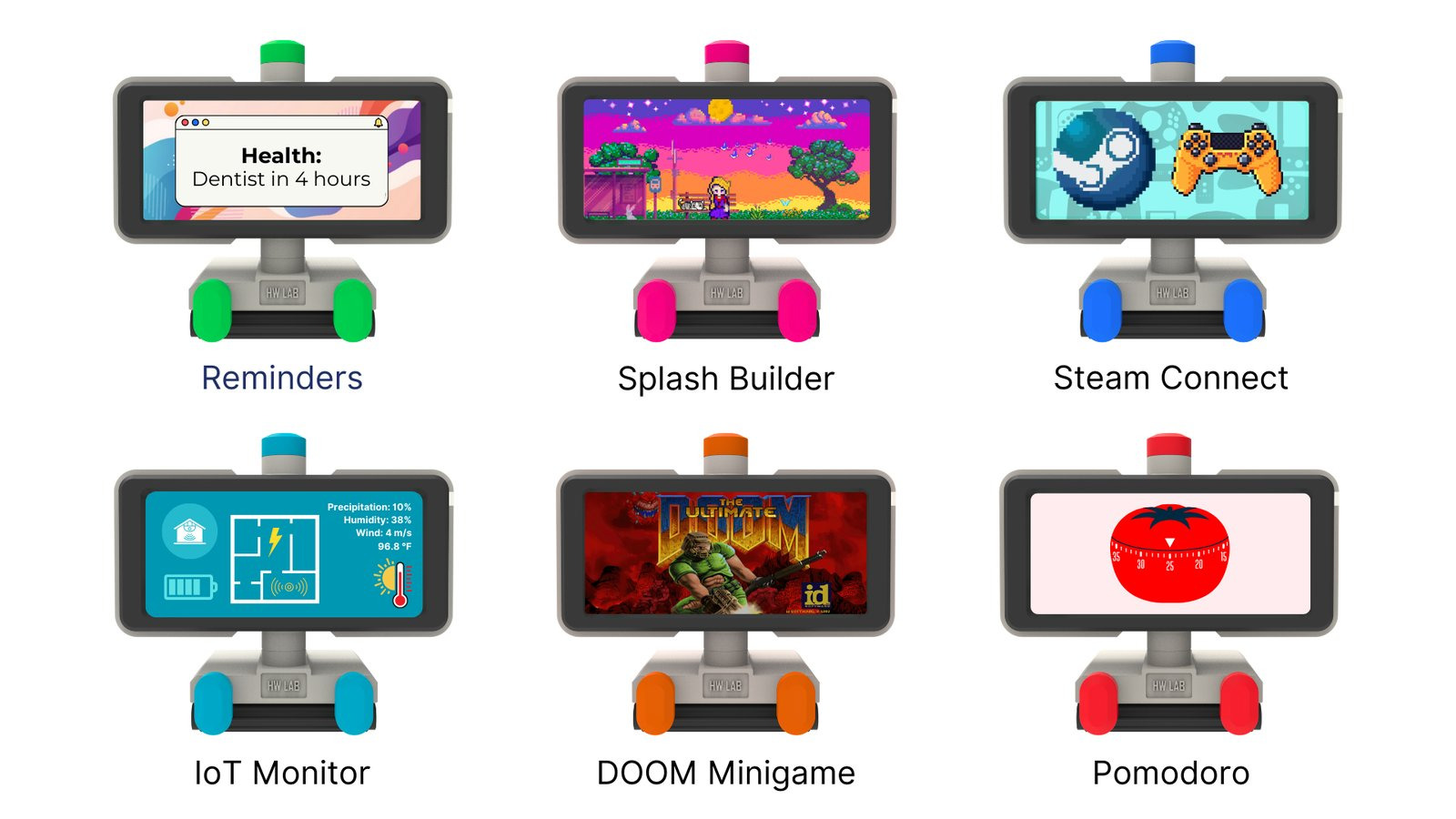 WebScreen will have a planned marketplace for JavaScript apps, enclosure designs, and hardware modifications. Current app examples include reminders, a Pomodoro timer, a Doom minigame, and smart home monitors. Enclosure colors include black, blue, green, pink, red, and orange. Manufacturing includes in-house 3D printing of enclosures in Japan, with Mouser Electronics handling global fulfillment via Crowd Supply. Risks specified include tariff changes, component shortages, firmware bugs, and certification delays.