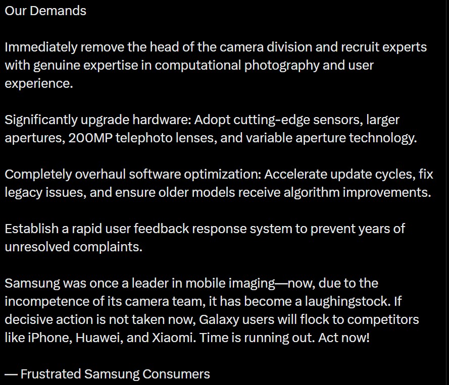 Based on these reasons, Ice Universe has not only decided to keep posting the open letter every day on X, but is also moving a petition. Titled “Urgent Replacement of Samsung Camera Division Head”, the petition has gained over 3,000 verified signatures at the time of writing.