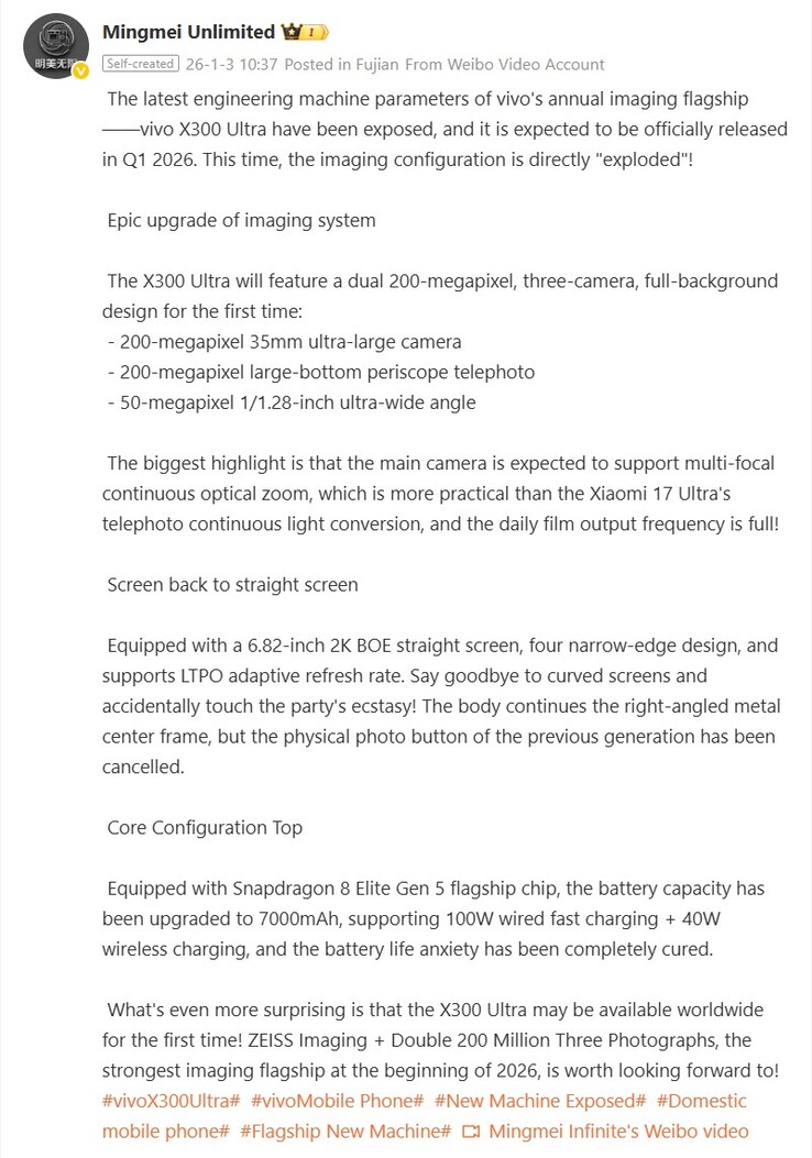 The first weekend of the year brings us a fairly spectacular rumor about the Vivo X300 Ultra, which is expected to be the first Vivo Ultra flagship to launch globally and is anticipated to debut in first quarter, likely in March. According to a Weibo user (see screenshot below), the Vivo X300 Ultra will feature a 200MP 35mm main camera, a 200MP periscope telephoto camera and a large 1/1.28-inch 50MP ultra-wide camera, which is not exactly new intel.