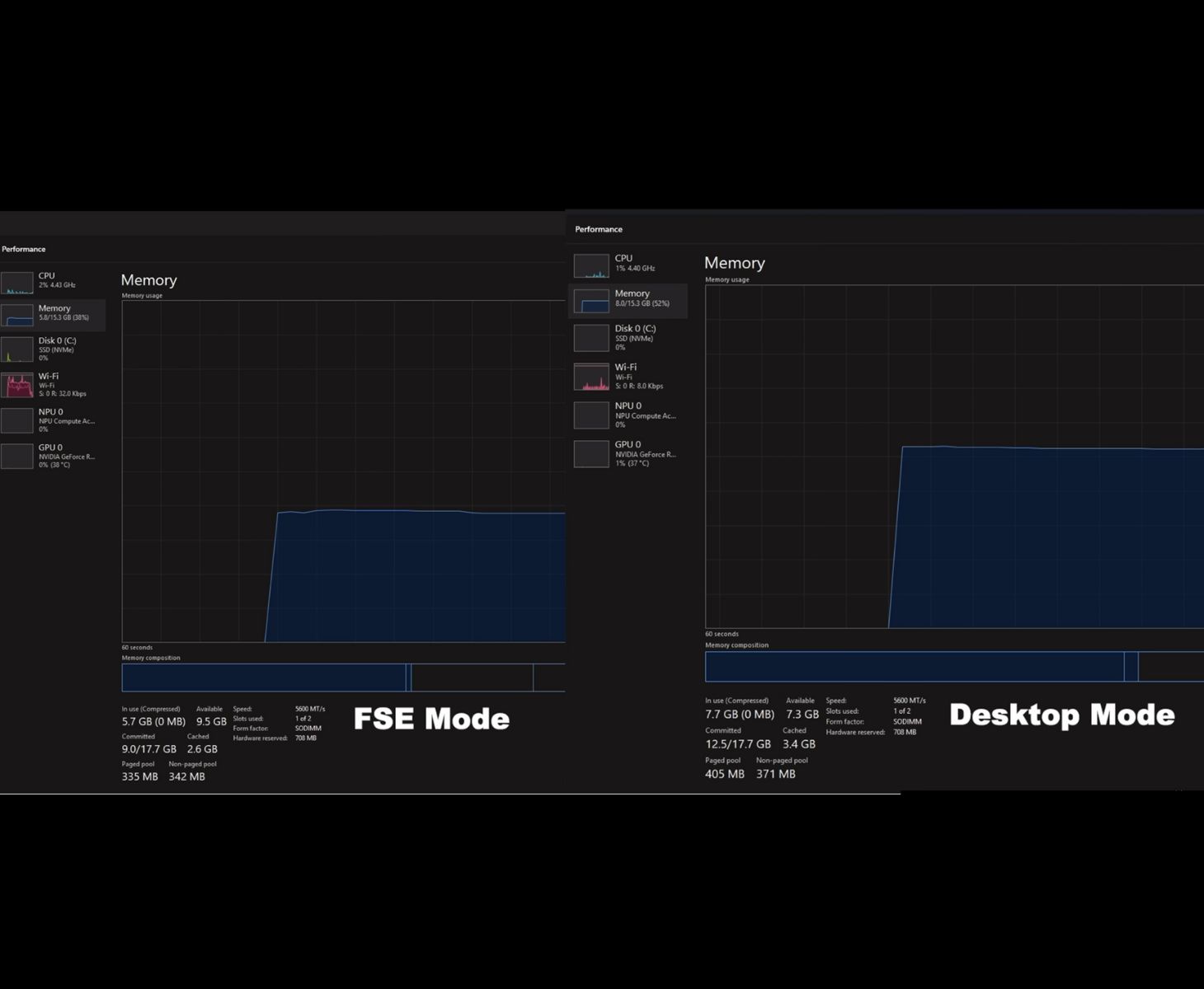 A notable aspect of FSE is its ability to suspend the standard Windows desktop environment, reducing background processes and lowering overall memory usage. In testing shown by the YouTuber, a gaming laptop equipped with an Nvidia GeForce RTX 5050 used around 5.7 GB of RAM in FSE compared with 7.7 GB in regular desktop mode, aligning with Microsoft’s claim of roughly 2 GB saved. This reduction may significantly benefit systems with limited memory or integrated graphics configurations that rely on shared RAM.